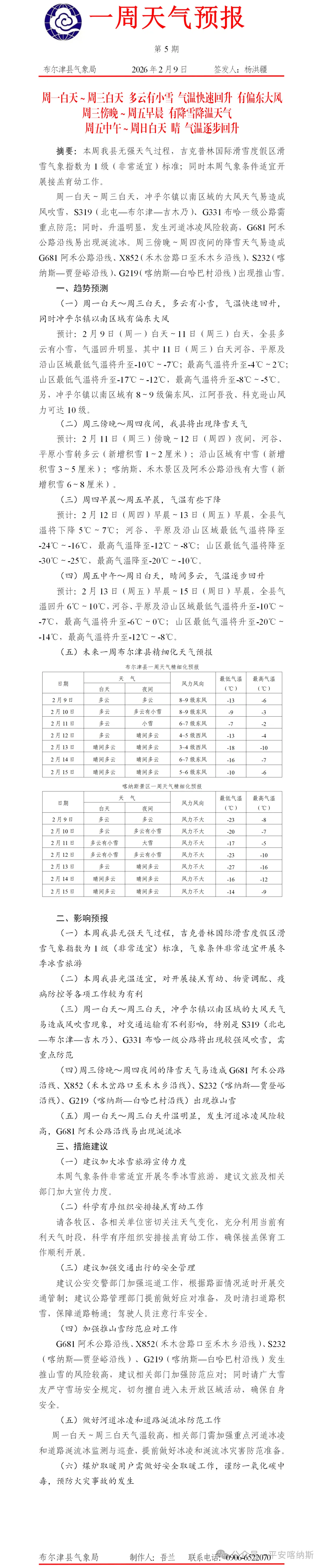 近期,喀纳斯景区将迎来新一轮降雪降温,气温逐步回升天气过程,气温将伴随明显下降,降雪易导致景区道路积雪、结冰,通行条件复杂,交通安全风险显著提升。为保障广大群众景区出行安全顺畅,现将天气预报、景区路况及交通安全提示公布如下: