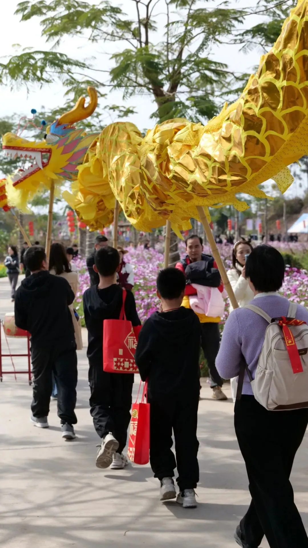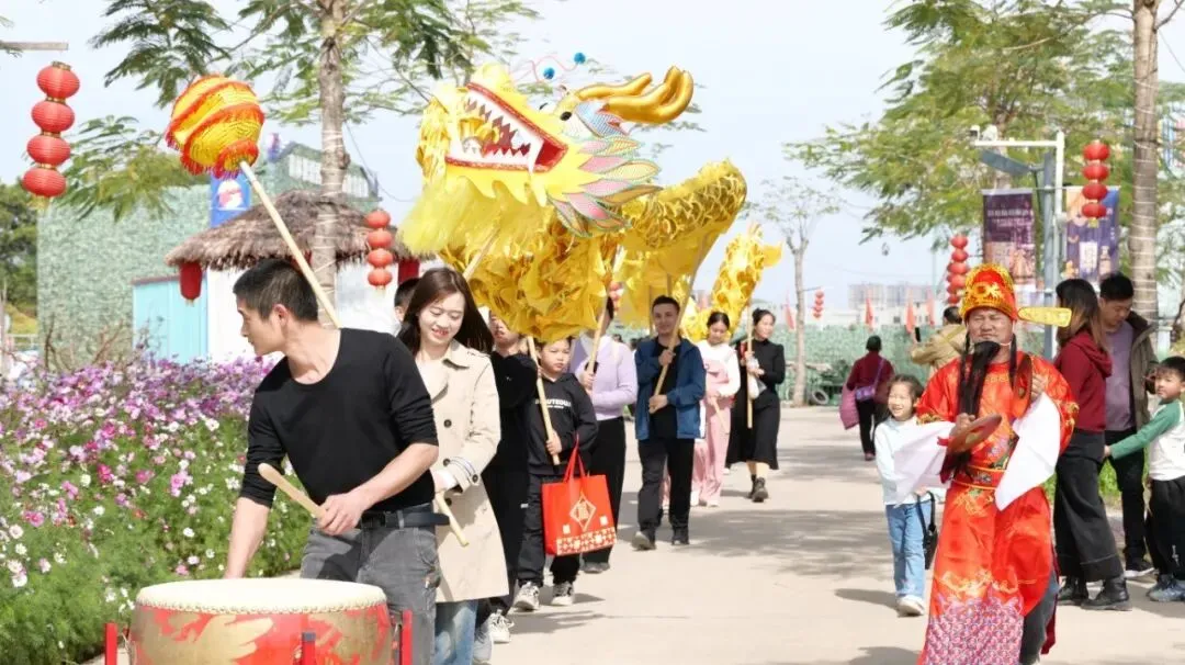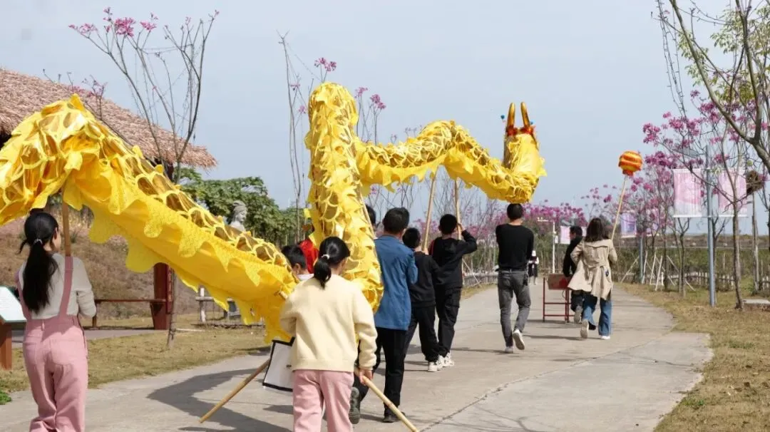 传统舞龙表演霸气登场,金黄龙身熠熠生辉,伴随着铿锵有力的锣鼓声,舞龙选手身姿矫健,龙身腾跃翻转、昂首摆尾,时而盘旋起舞,时而穿梭前行,尽显新春祥瑞之气,游客还可免费参与