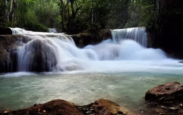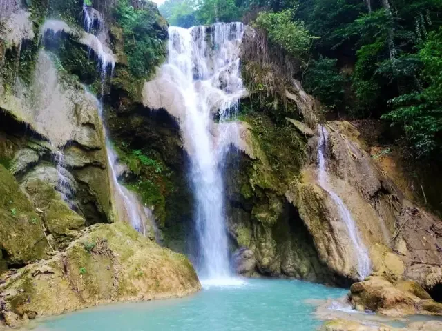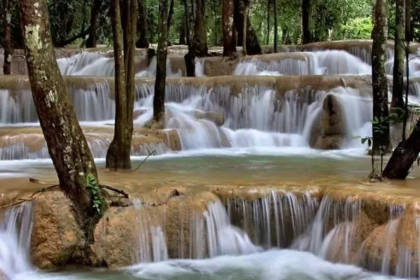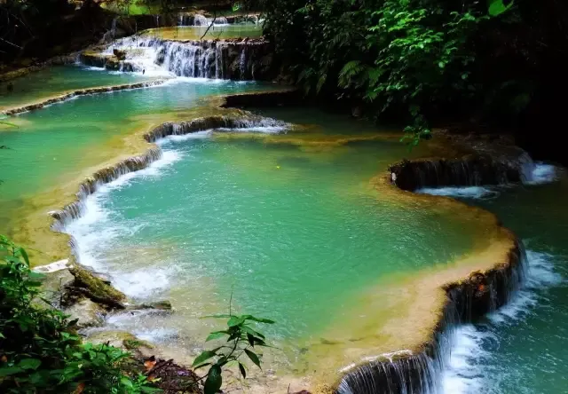 光西瀑布从石灰石山峰倾泻而下,注入下面一系列清凉、翠绿色的水潭中。