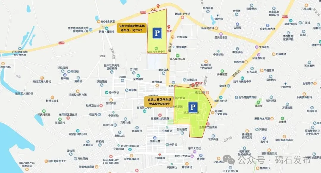 碣石镇玄武山春节朝拜(年初三-初四)高峰将至,为满足广大自驾游客来朝拜时车辆停放需求,碣石镇设置玉燕中学临时停车场及玄武山文化广场停车场,其中:玉燕中学临时停车场开放时间为:2026年2月19日至2月20日(年初三-初四日,后续开放时间视情况而定),具体停车点位分布见附表。请广大车主朋友自行规范停车并妥善保管自己的物品,祝愿广大游客碣石之旅安全愉快!