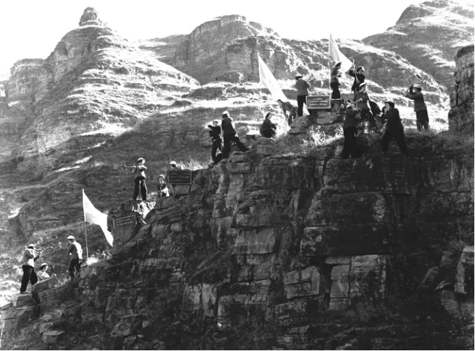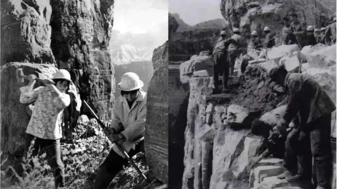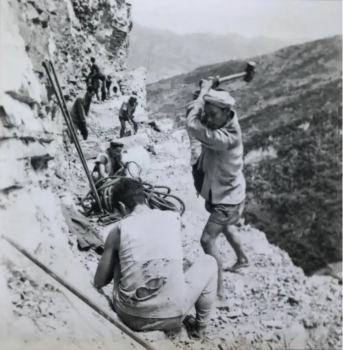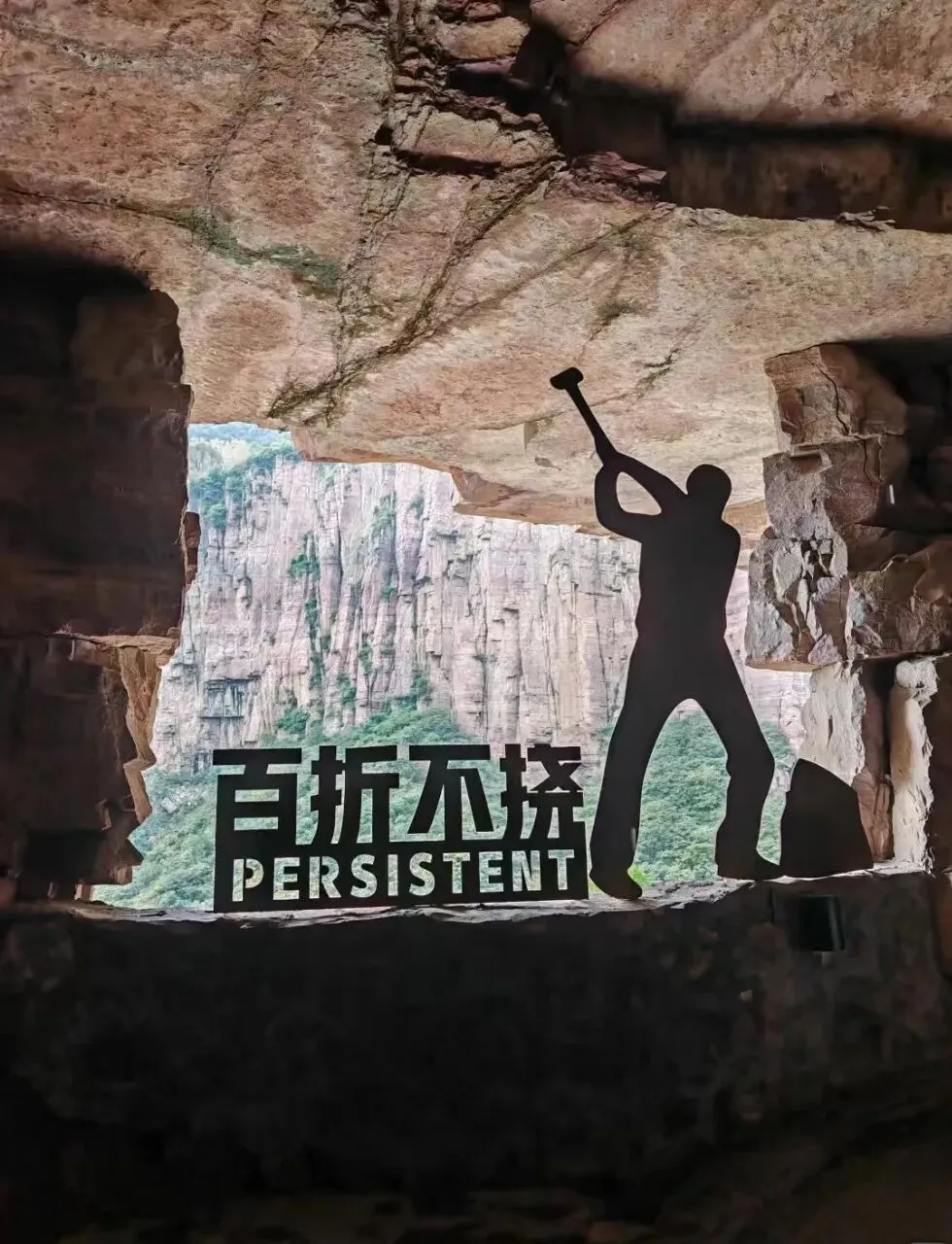 下了摆渡车步行没多久,远远就看见了“绝壁长廊”四个大字刻在一块长方形的巨大石碑上。到了!我似乎听见了“咚”“咚”的敲凿声响成一片,似乎看见了推着独轮车的村民把开凿出的石块从洞里推了出来,看见了小孩子们两人一组抬着小筐子吃力地将石块从洞里抬了出来,看见了妇女们将做好的饭菜烧好的热水送到了工地上......