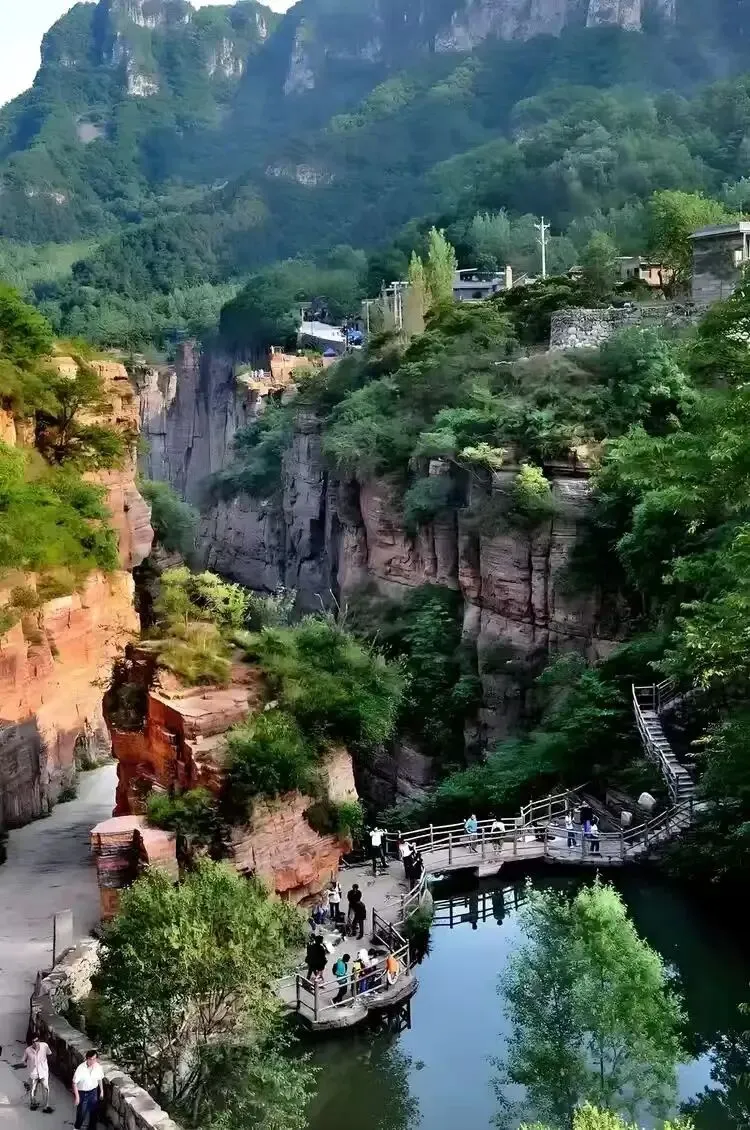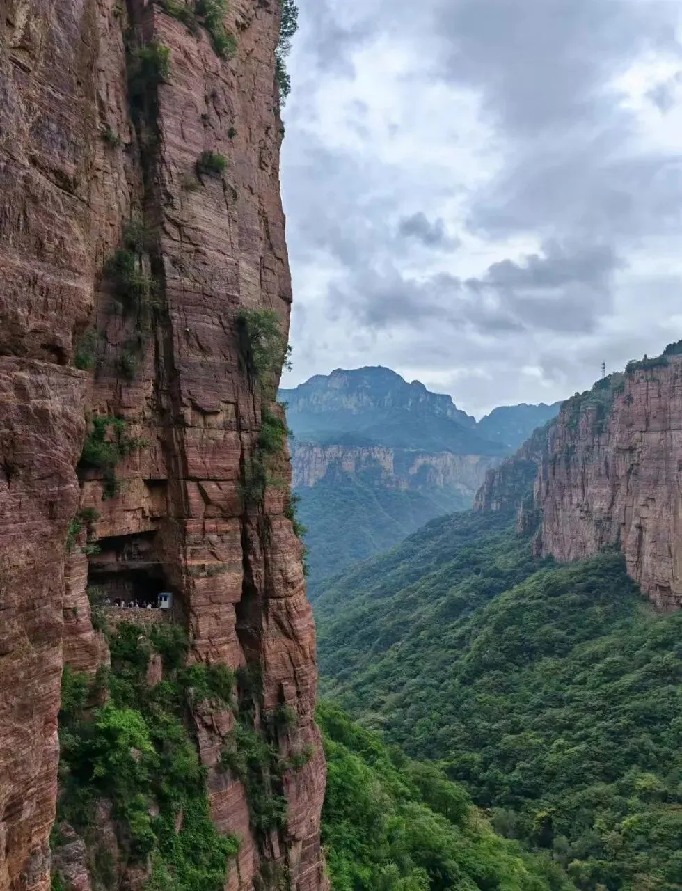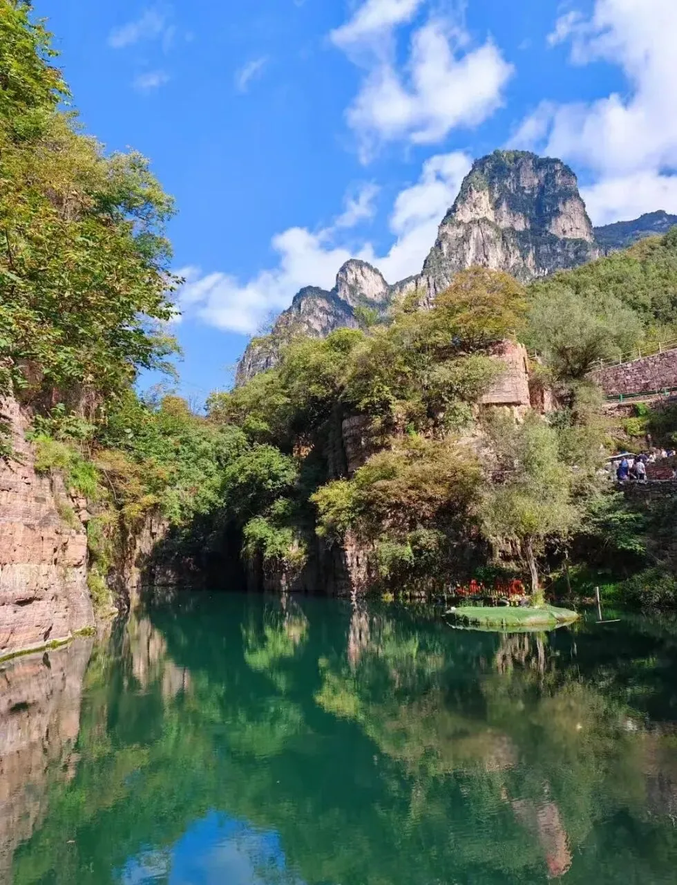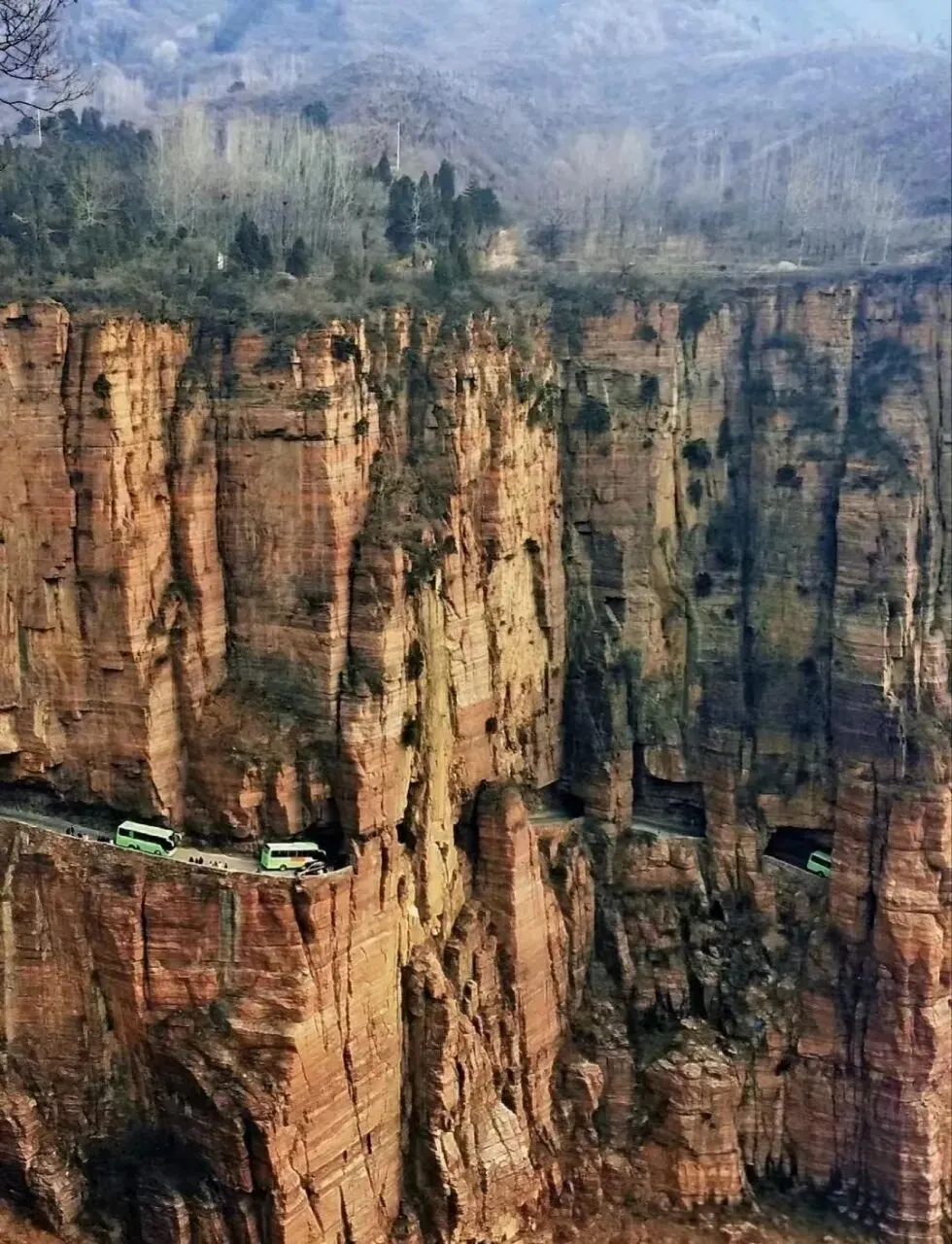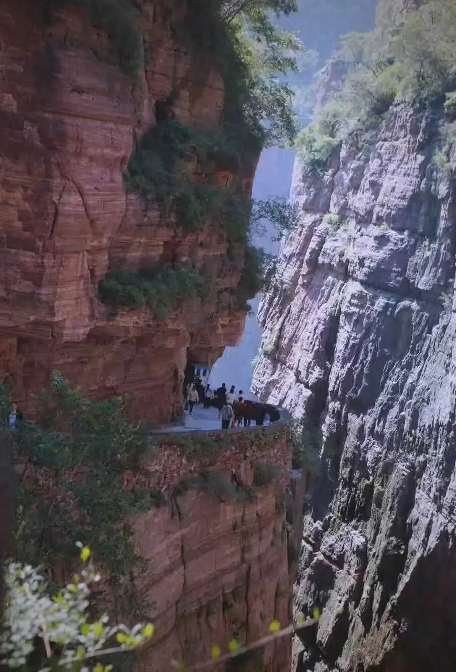 从我工作的河南焦作中站区开车大约走了两个多小时才到景区。我们按照规定换乘景区摆渡车继续前行。崎岖蜿蜒的山道如一条巨龙盘旋于悬崖绝壁中段。一侧是万仞险峰,一侧是万丈深渊。我坐在紧邻深渊这侧靠着车窗的座位,随着车的前行,坐姿由最初的懒散变成了正襟危坐,左手紧紧抓着安全带,右手紧紧抓着前座靠背扶手。心里暗想,多亏不让自驾进去,否则,就我这三把刀驾驶水平和小老鼠胆,还不给吓得魂飞魄散了?