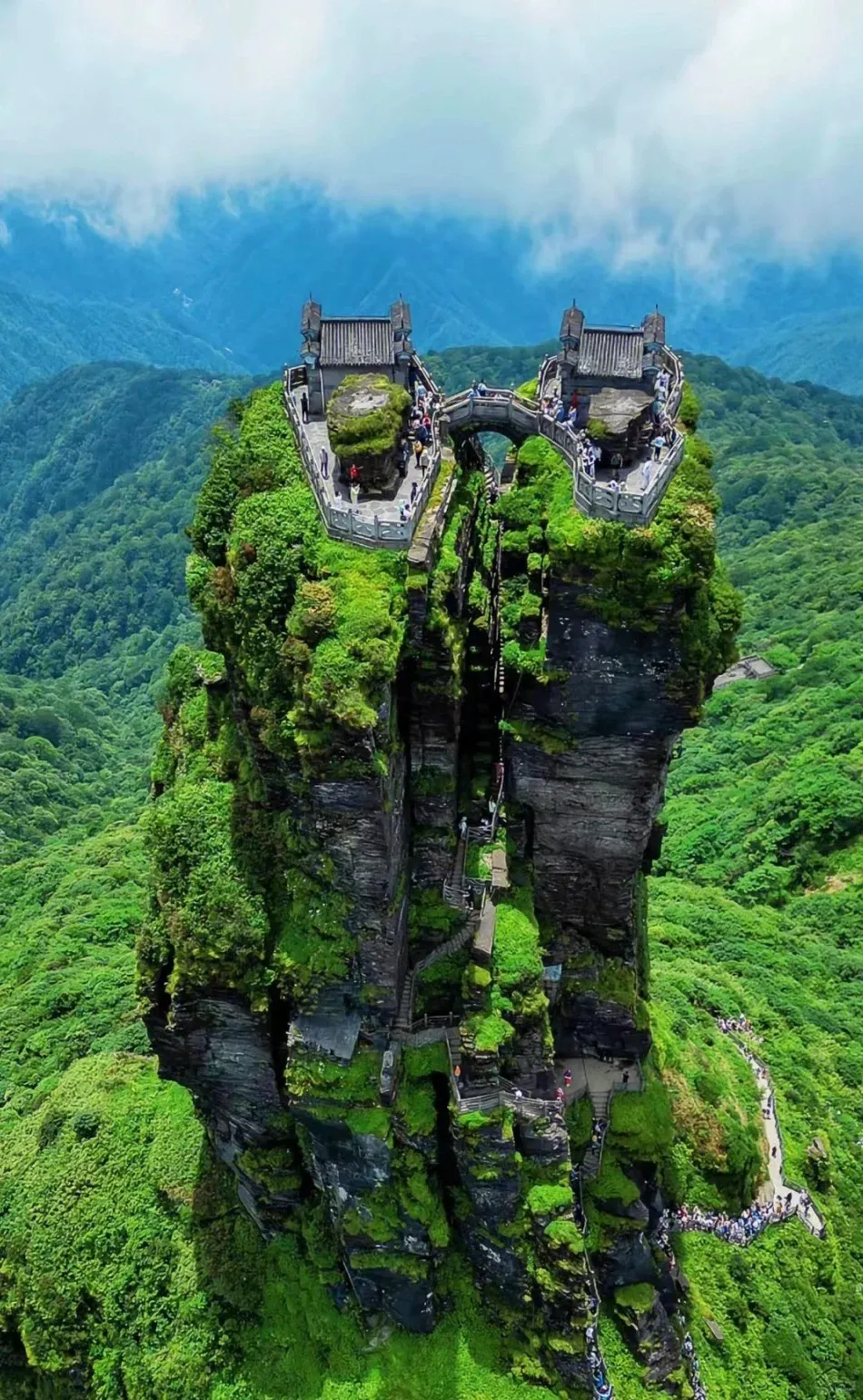 红云金顶最有名,两座殿中间靠一条天桥连着,风一吹,心里都跟着抖一抖。