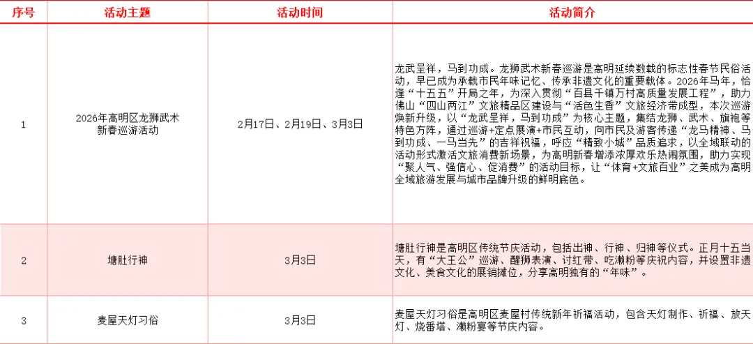 此外,正月十五(3月3日),两项独具高明特色的民俗活动还将精彩上演。其中,塘肚行神包含“大王公”巡游、醒狮表演等丰富内容;麦屋天灯习俗则有天灯制作、祈福、放天灯等环节,共同分享高明独有的“年味”记忆。