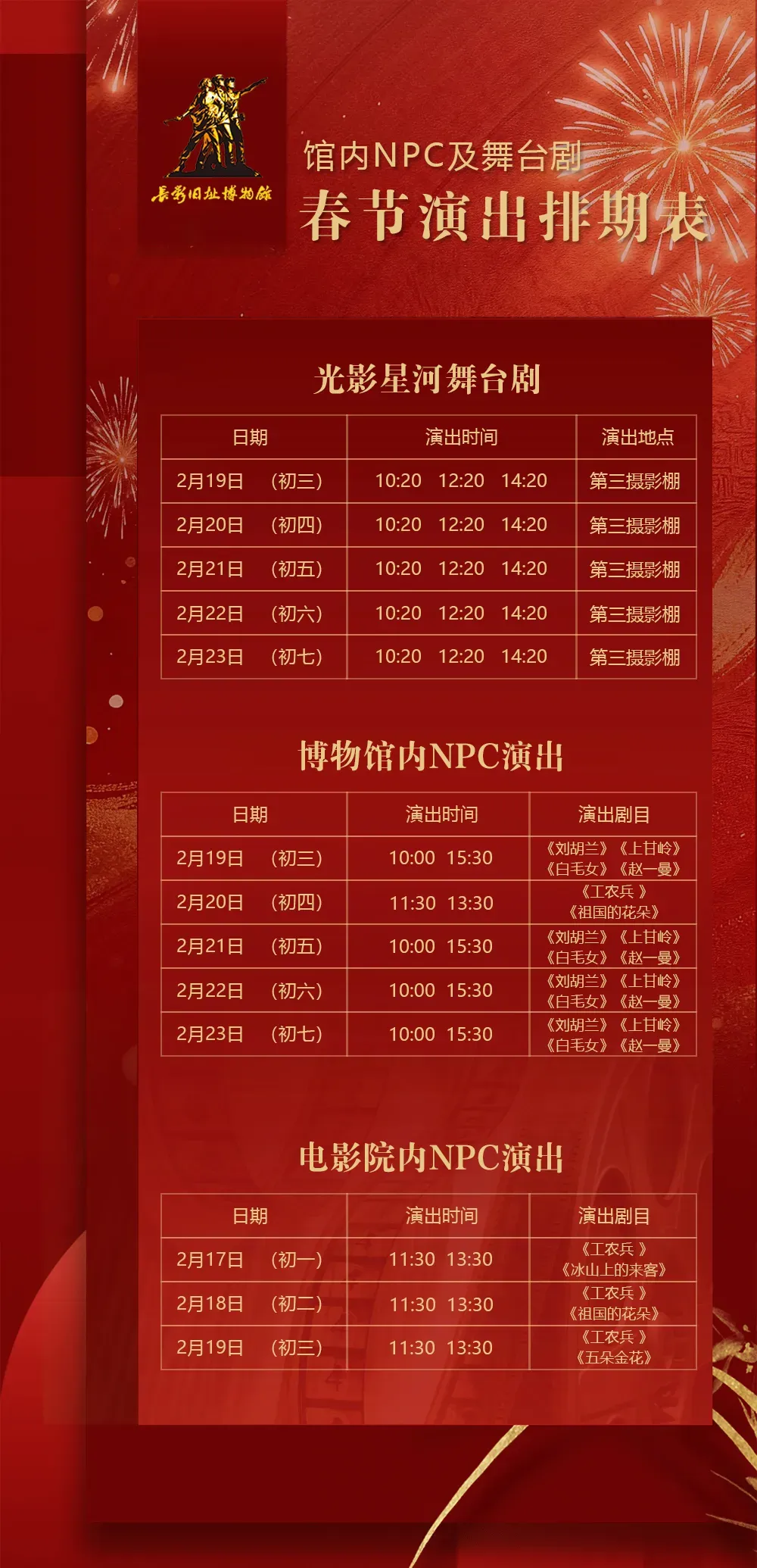2月10日,长影旧址博物馆发布春节营业时间及演出排期。具体如下: