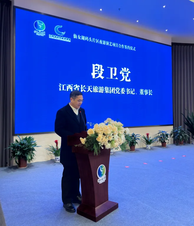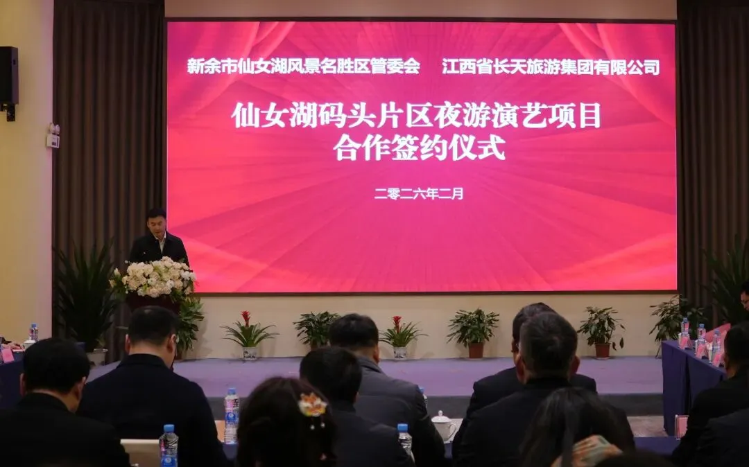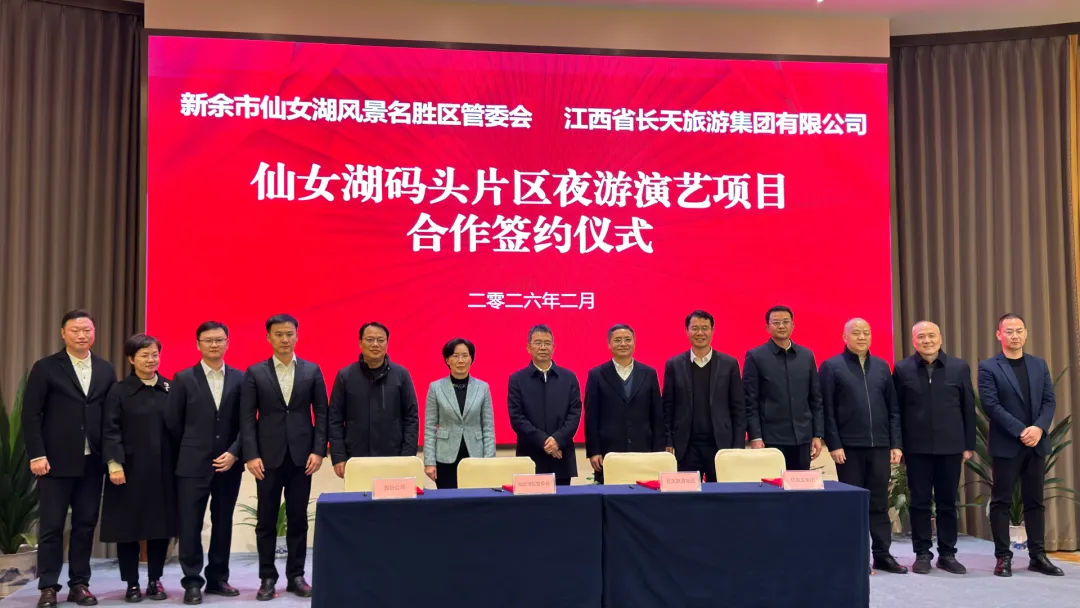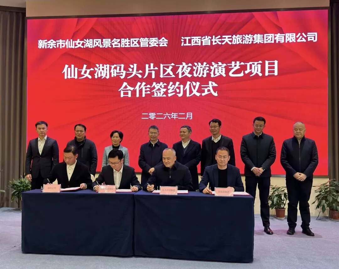 2026年2月11日晚,仙女湖码头片区夜游演艺项目签约仪式在长旅沁庐假日酒店(仙女湖店)隆重举行。江西长天旅游集团与仙女湖区管委会正式签署项目投资运营合作协议,标志着投资2亿元的仙女湖夜游演艺项目正式启动。