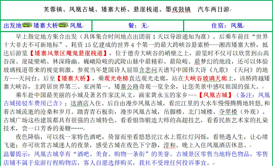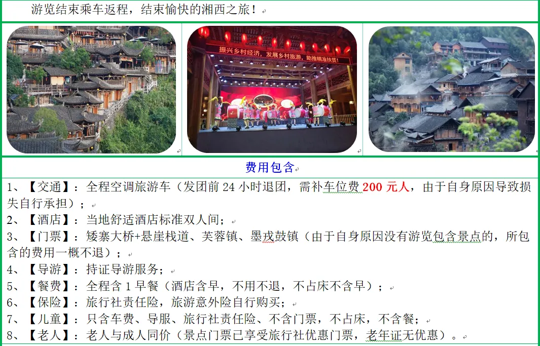 💛费用包含:长沙出发2天旅游车费+景区大门票(矮寨大桥、悬崖栈道、芙蓉镇、墨戎鼓镇)+1晚住宿(每间房赠送2份早餐)+导游服务+保险