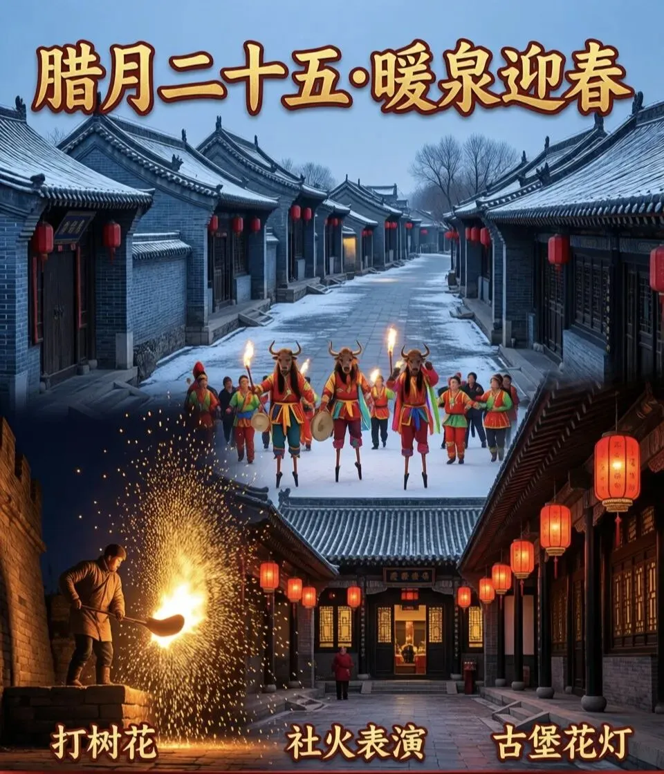 * 核心亮点: 国家级非遗“打树花”是这里的招牌,将滚烫的铁水泼洒向城墙,迸溅出璀璨的“铁花火雨”,视觉冲击力远超烟花。此外,古镇内还有精彩的社火表演、踩高跷和扭秧歌。