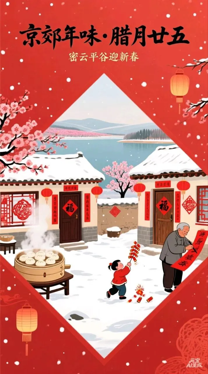 * 密云推荐: 可以去东邵渠镇参加汇源大集年货节,或者去溪翁庄镇参加“年味溪翁庄”活动,不仅能逛非遗市集,还能品尝水库鱼鲜。