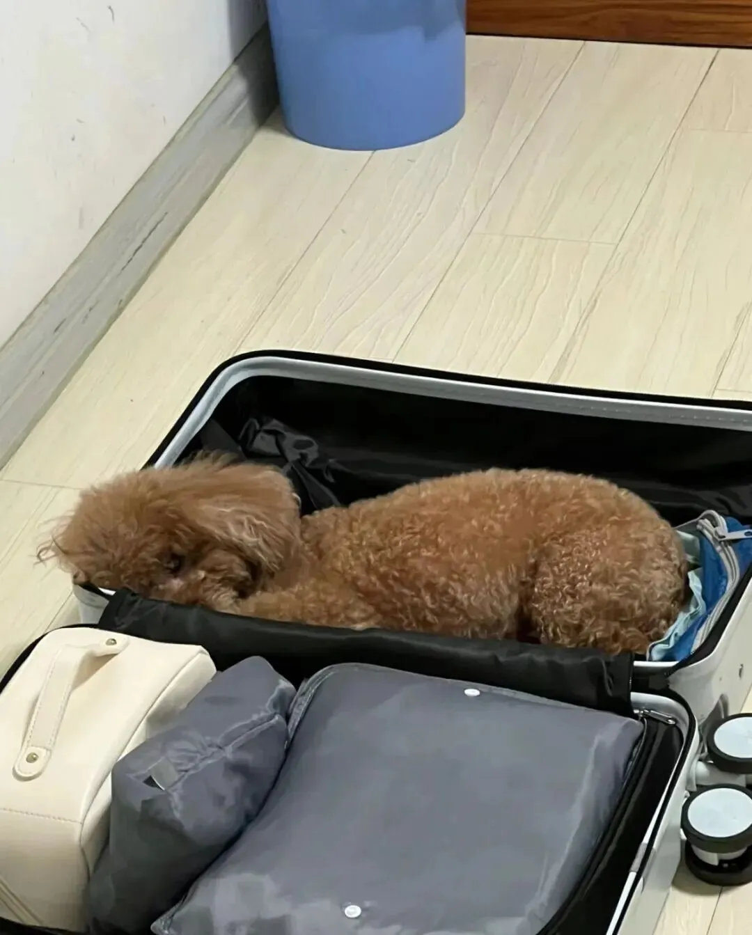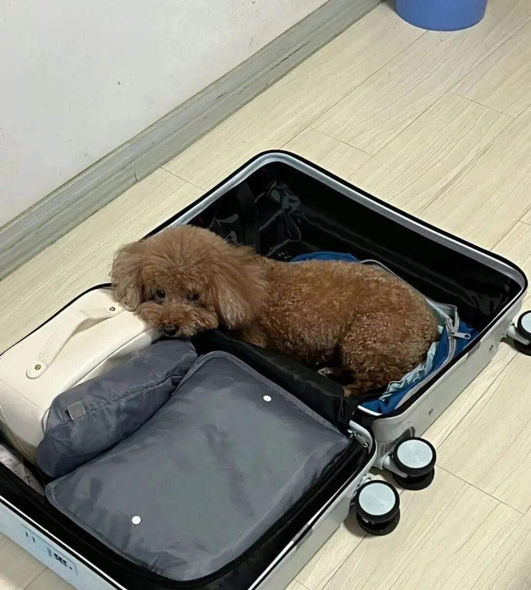 事情是这样的 , 一位网友准备出去旅游 , 刚把行李箱打开在那收拾呢 , 她家狗子就自己溜达过来了 , 看了一眼箱子 , 然后噌的一下就跳进去 , 往里面一躺 , 开始叹气~