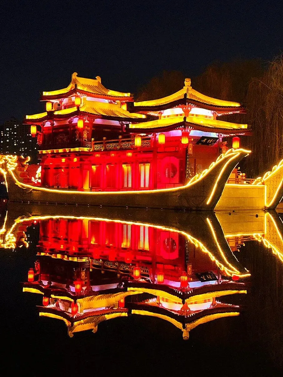 ✨特色:39组唐诗灯组把300余首古诗变成光影长卷,紫云楼前无人机天幕秀+花船巡游,非遗苏绣、竹编藏在灯影里;晚上坐游船看水上花灯,梦回盛唐。