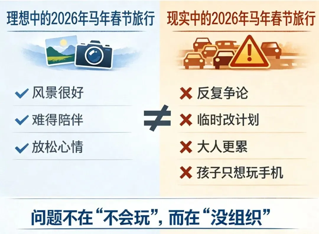 每到春节假期,朋友圈里总能看到两类画面。 一类是风景照:雪山、沙滩、古城,看起来岁月静好。 一类是吐槽贴:堵车、排队、孩子闹、大人累,假期过得比上班还奔溃。 很多家庭的春节旅游,真实体验往往是这样: 出发前反复争论去哪、怎么去、住哪里 路上遇到不顺便相互埋怨、不断改计划、各种临时应对 到了目的地,依旧匆忙和焦躁 大人累趴,而孩子觉得无聊,只想玩手机