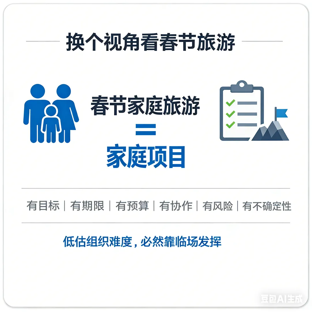 问题真的出在“不会玩”吗? 如果从管理的角度看,我们会发现: 春节假期的家庭旅游,本质上是一件高度复杂的协作任务,是一个项目,却常常被我们当成一次随意的出行。 如果把“春节家庭旅游”放到管理学的框架里,它几乎完全符合一个“项目”的定义: 有明确目标:放松、陪伴、见世面 有时间限制:假期有限 有资源约束:预算、精力、交通条件 有多方干系人:大人、孩子、老人 有高度不确定性:天气、人流、拥堵、情绪波动 换句话说: 不是春节旅游太复杂,而是我们低估了它的组织难度。 当一件事具备这些特征,却没有人负责规划、协调和兜底,结果往往只有一个——靠临场发挥硬扛。