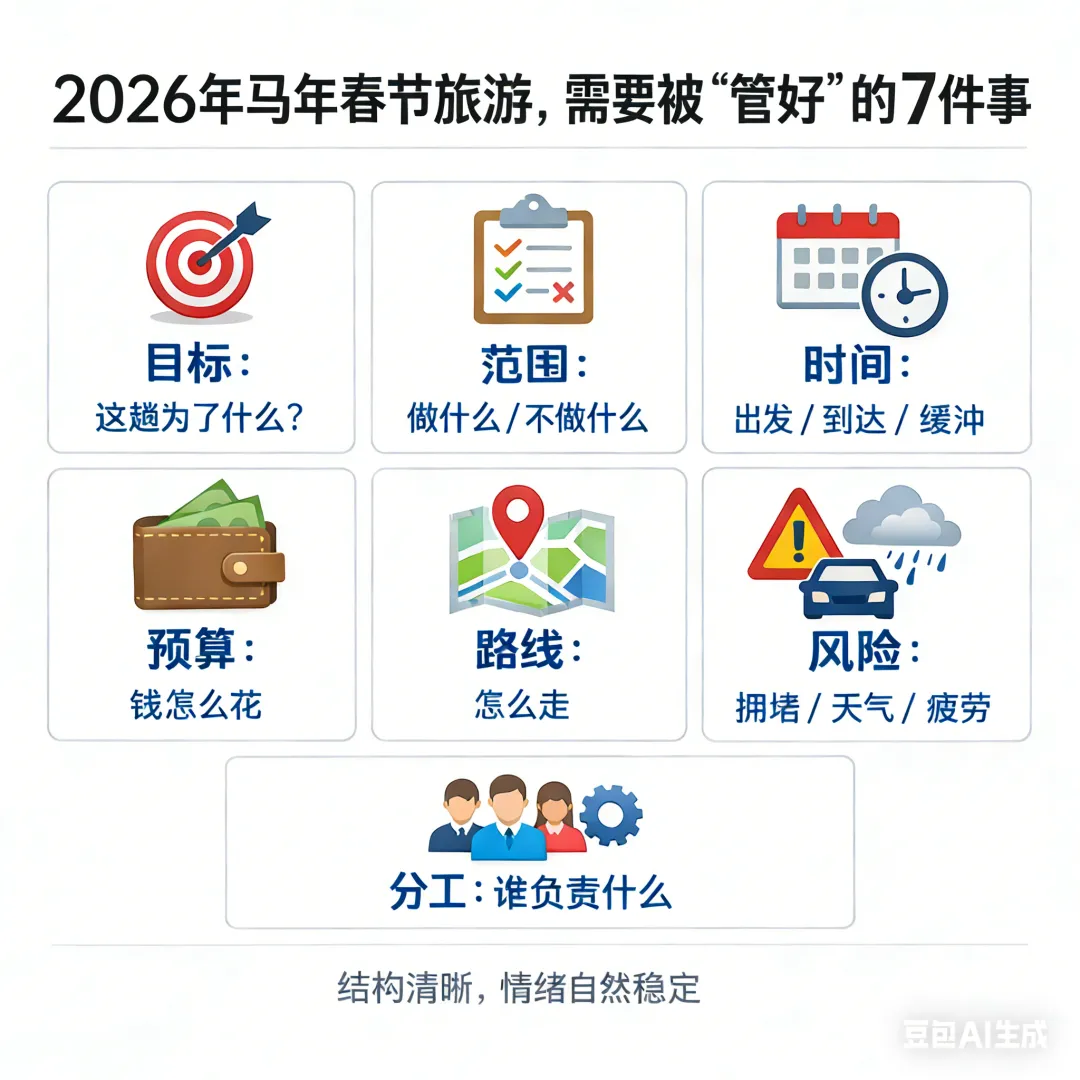 很多家庭旅游的问题,就是结构缺失导致的。 如果用项目管理的方式拆解,一次家庭集体出游,至少要想清楚这七件事: 是多看几个景点,还是吃多几家美食,还是就家庭聚聚, 如果目标不清,后面的所有安排都会互相打架。 去哪、不去哪;玩什么、不玩什么。 范围不进行限制,行程一定会失控。 出发时间、到达时间、缓冲时间。 春节最大的风险,往往不是计划太少,而是太多,没有预留足够的缓冲时间。 如果在行程中,每天能预留2小时的自由时间作为应急或缓冲,那就会从容得多。 交通、住宿、餐饮、门票、总预算。 预算不清,途中每个决定都会变成争论点。 拥堵、下雨、排队过久、孩子疲劳、突发状况。 成熟的计划,是默认“会出问题”,而不是幻想一切顺利。 如果出发前,全家能共同头脑风暴“最可能发生的3件糟心事”,并约定好如果发生怎么处理,那就能很好让全家松弛下来。 谁查攻略?谁订票?谁照看孩子? 如果没有把责任落实到人,最后很容易乱成一团,相互埋怨。 哪些安排有效?哪些是坑? 如果不复盘,下次还会踩同样的雷。 很多旅游中的矛盾,本质上就是项目失控的结果。 在每次旅游的返程路上,可以用下面问题进行复盘: 如果下次再来,我们会保留什么?一定要改掉或调整的是什么?