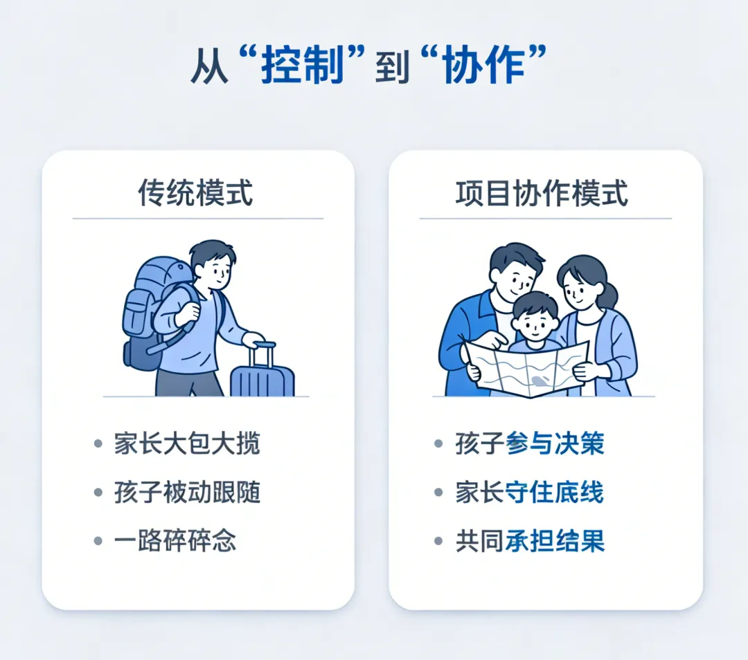 你可以尝试这样做: 让孩子制定家庭旅行计划: 去哪里(查资料、比方案) 怎么去(高铁还是飞机,时间和成本对比) 住哪(位置、价格、便利性) 玩什么(取舍,而不是全都要) 大概预算(知道钱不是无限的) 家长只守住三条底线: 安全底线 时间底线 预算底线 其他部分,允许孩子试错、允许不完美。 我们会惊讶地发现: 孩子开始主动查信息, 行程不顺时,也更容易接受结果, 因为那是他参与决策后的结果。