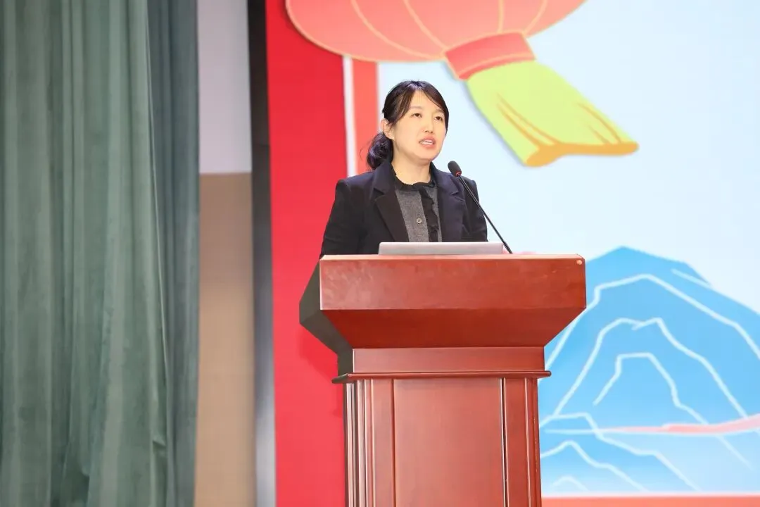 杨静作总结讲话。她向全体师生致以诚挚的新年祝福,并勉励大家利用假期沉淀自我、亲近家庭、关注社会,以更饱满的状态迎接新学期。