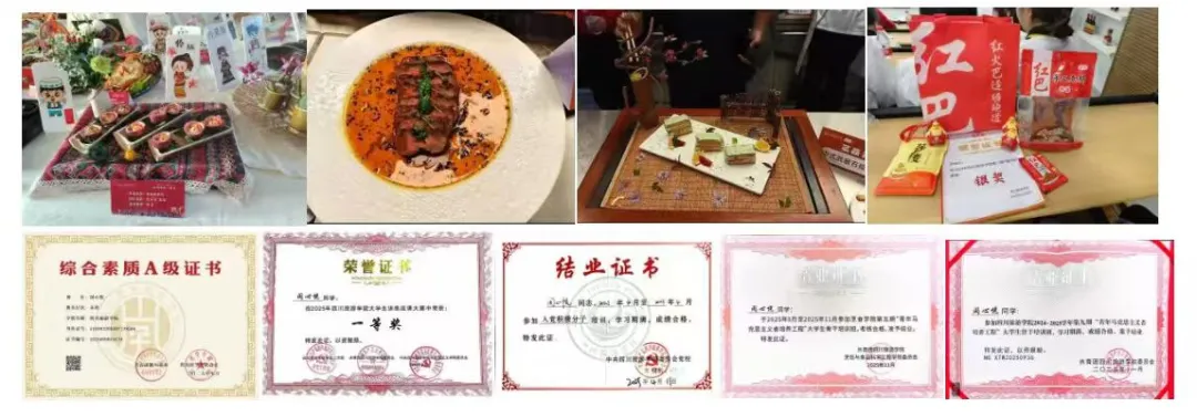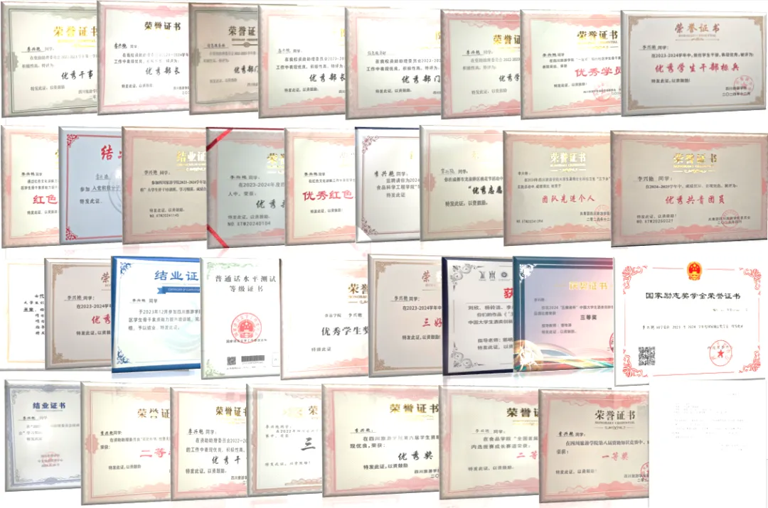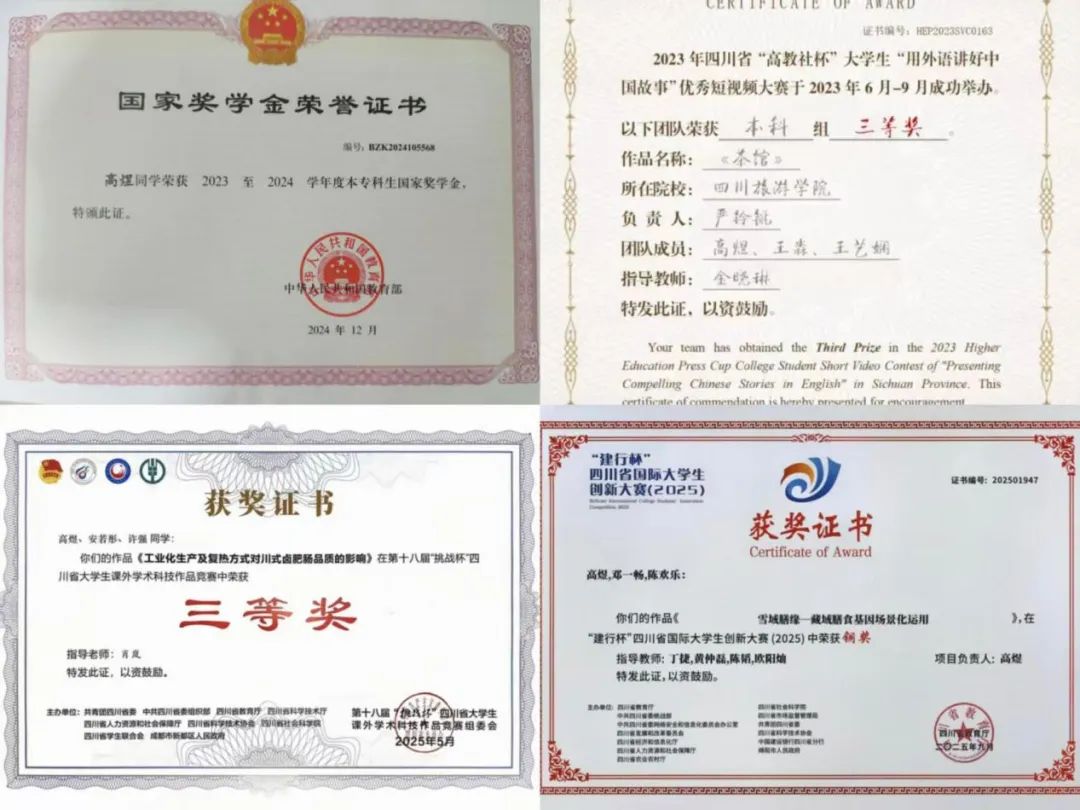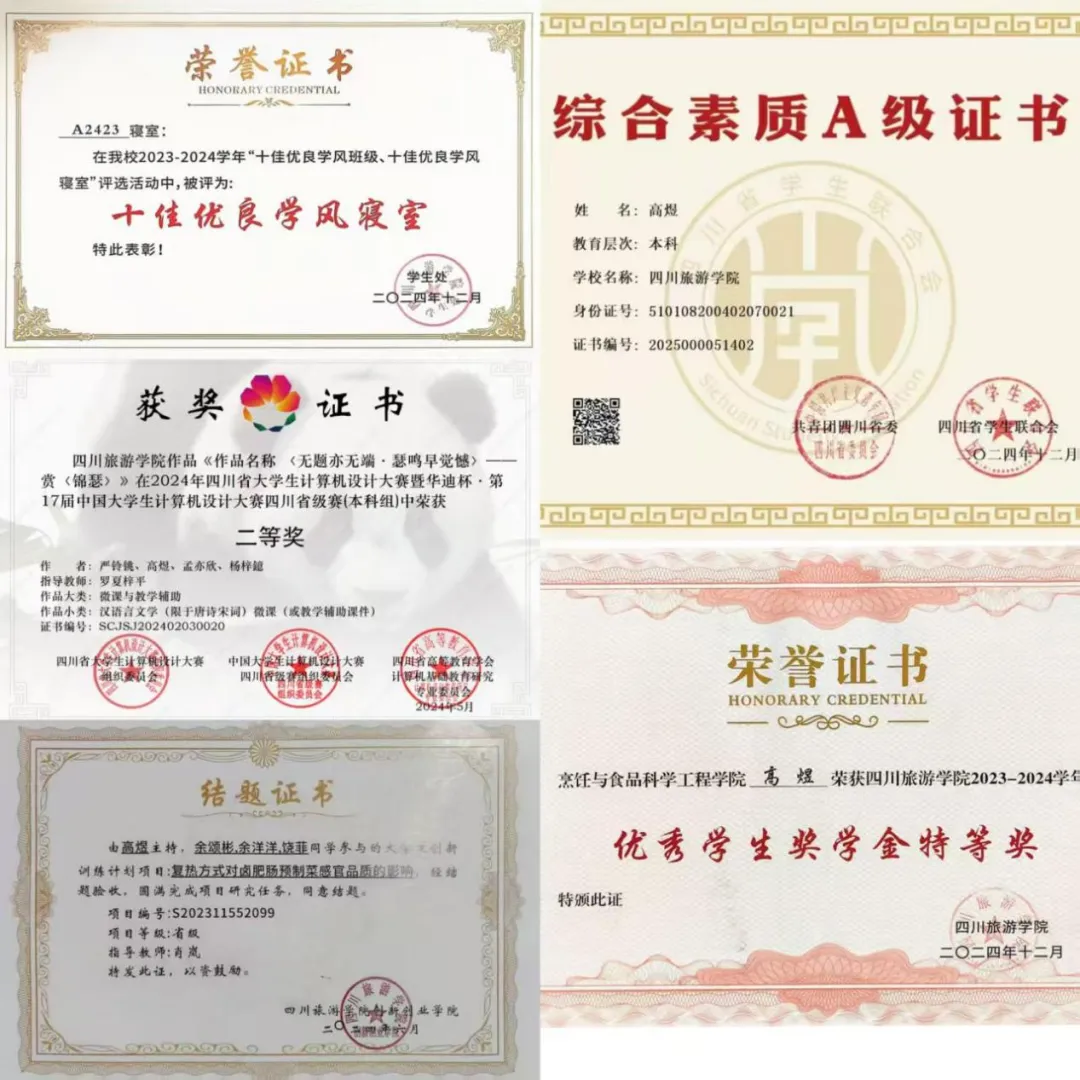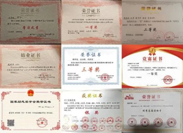 连续三年综测排名位居专业第一、学习成绩排名位居专业前10%,曾两次获国家奖学金、两次获优秀学生特等奖学金,获四川省综合素质A级证书、四川旅游学院卓越超越好青年、优秀学生干部标兵、三好学生标兵、优秀共青团员、十佳优良学风寝室等荣誉称号。获国家级奖项四项、省级奖项七项、市级奖项一项、校级奖项三十余项,参与发表SCI论文一篇、EI论文一篇、中文核心论文一篇、会议论文一篇,申请欧盟国际专利一项,参与科研项目共九项。曾两次获“优秀志愿者”荣誉称号。
