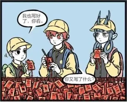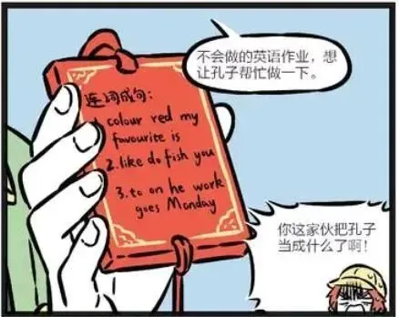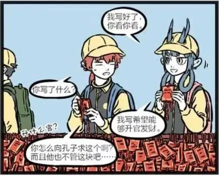 哪咤也写好了祈福牌,给善财看。善财问哪咤又写了什么?哪咤却天真的说:不会做的英语作业,想让孔子帮忙做一下。善财听后感到很不可思议,就对哪咤说:你这家伙把孔子当成什么了啊!