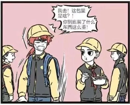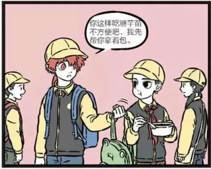 他们在孔夫庙祈福完之后,就一起来到了小吃街吃东西。善财看哪咤背着包吃糖芋苗不方便,于是就对哪咤说:你这样吃糖芋苗不方便吧,我先帮你拿着包。善财背上之后,感到很重,就问哪咤:我去!这包里是啥,你到底装了什么东西这么重!