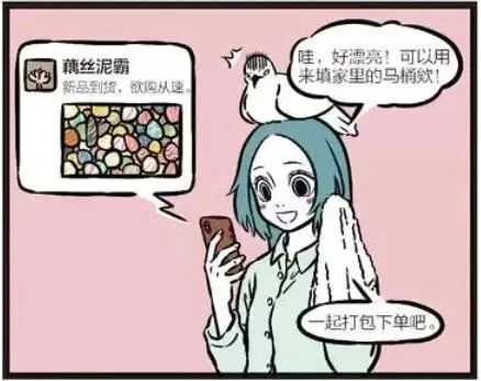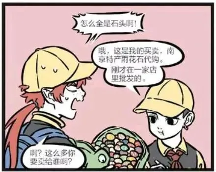 善财打开哪咤的包一看都是石头,于是问哪咤:怎么全是石头啊!哪咤说:哦,这是我的买卖,南京特产雨花石代购。刚才在一家店里批发的。善财听后很疑惑这么多他要卖给谁呢。原来就在刚刚哪咤就发了一个关于雨花石的朋友圈:新品到货,欲购从速。精卫刷到了这个朋友圈,看到这些雨花石感到很漂亮,说可以用来填家里的马桶,于是就打包下单了很多。