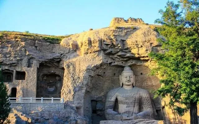 云冈石窟在大同 , 比龙门还早。 北魏时期开凿的 , 东西绵延一公里 , 大小造像将近六万尊。 风格和龙门不太一样 , 更粗犷 , 更有力量感。