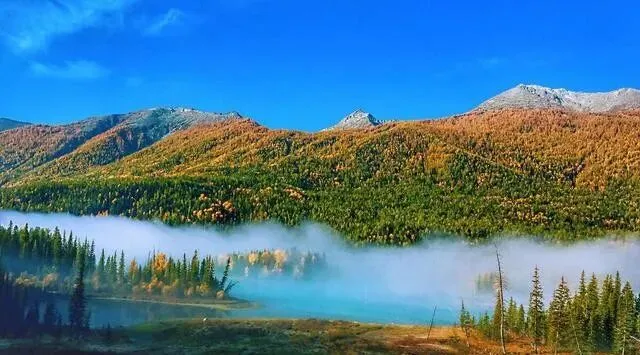 喀纳斯秋天去最美 , 湖水碧绿 , 两岸树全变黄了。 神仙湾的晨雾 , 月亮湾的弯 , 禾木的小木屋...更准确地说 , 这是中国版的瑞士。