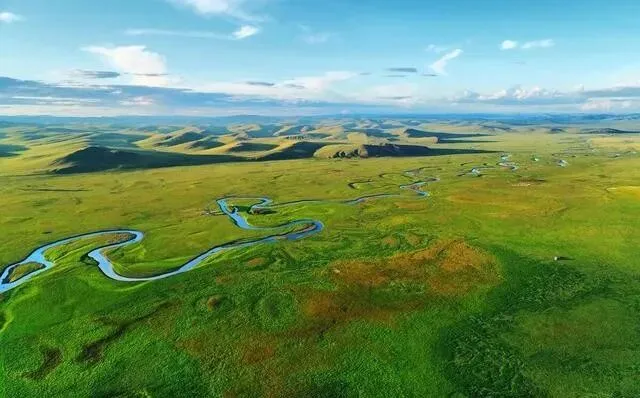 呼伦贝尔的草原和莫日格勒河 , 从空中看那条河 , 在草原上弯了不知道多少道弯 , 像一条蓝色丝带被风吹皱了。 夏天绿油油的 , 冬天白茫茫的 , 都好看。