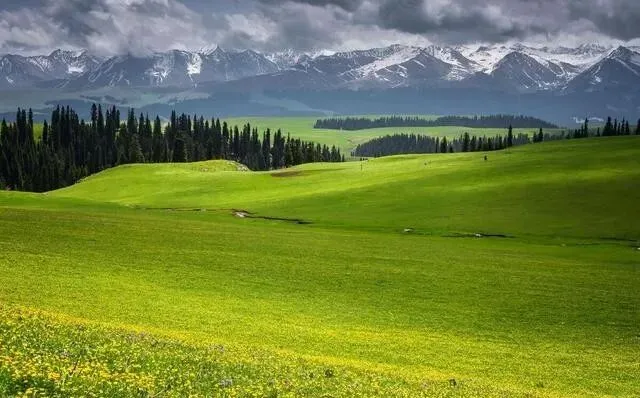 喀拉峻草原在伊犁 , 6到8月去。 草原、雪山、峡谷、森林一次全看到了 , 山坡上的野花开得密密麻麻 , 五颜六色铺满整个山头。
