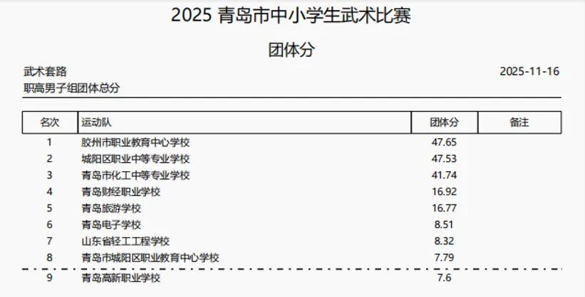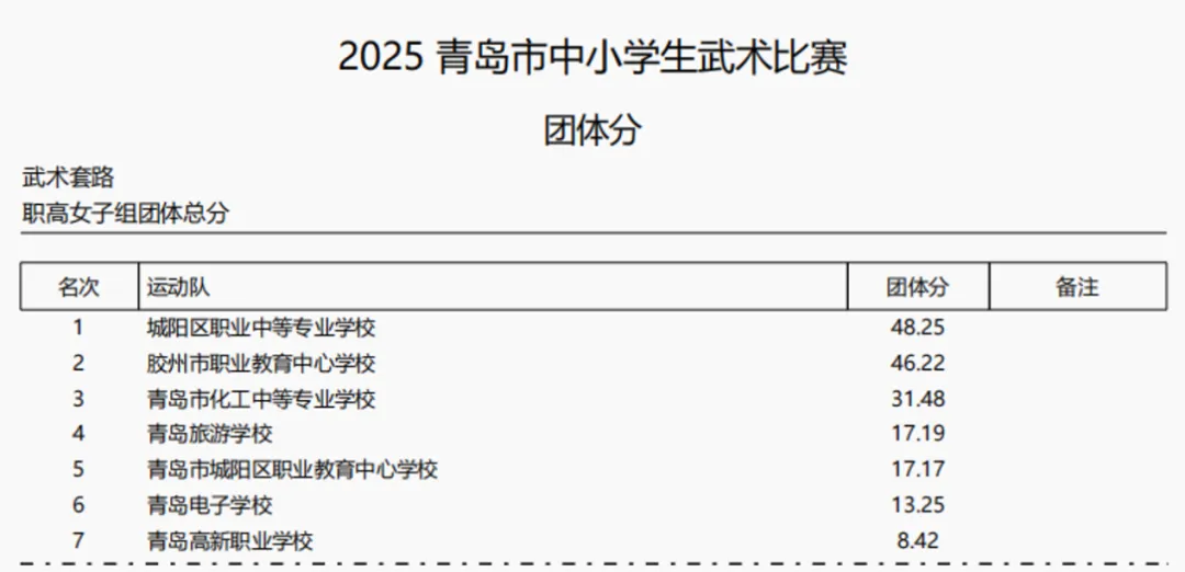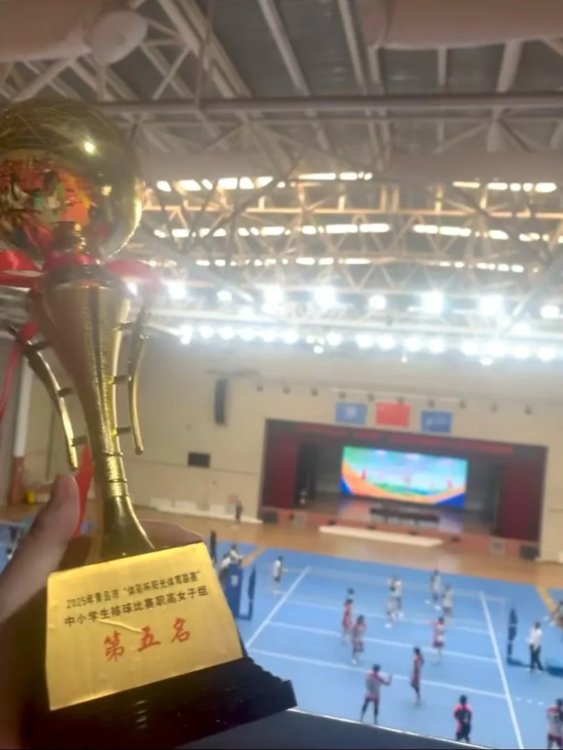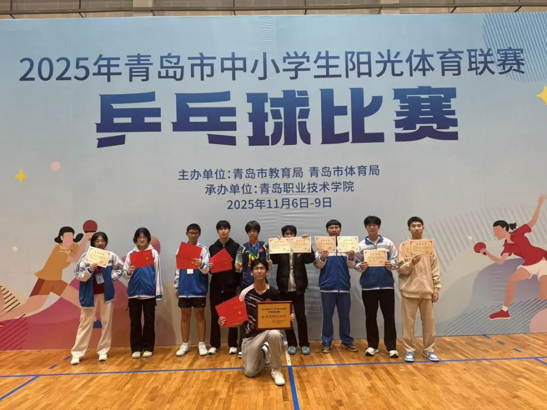 2025年,我校在青岛市阳光体育联赛中获得乒乓球比赛第一名;在青岛市阳光体育联赛中获得田径运动会团体总分第三名跳绳比赛总分第三名、武术比赛第四名、女子排球比赛第五名、男子篮球比赛第七名。