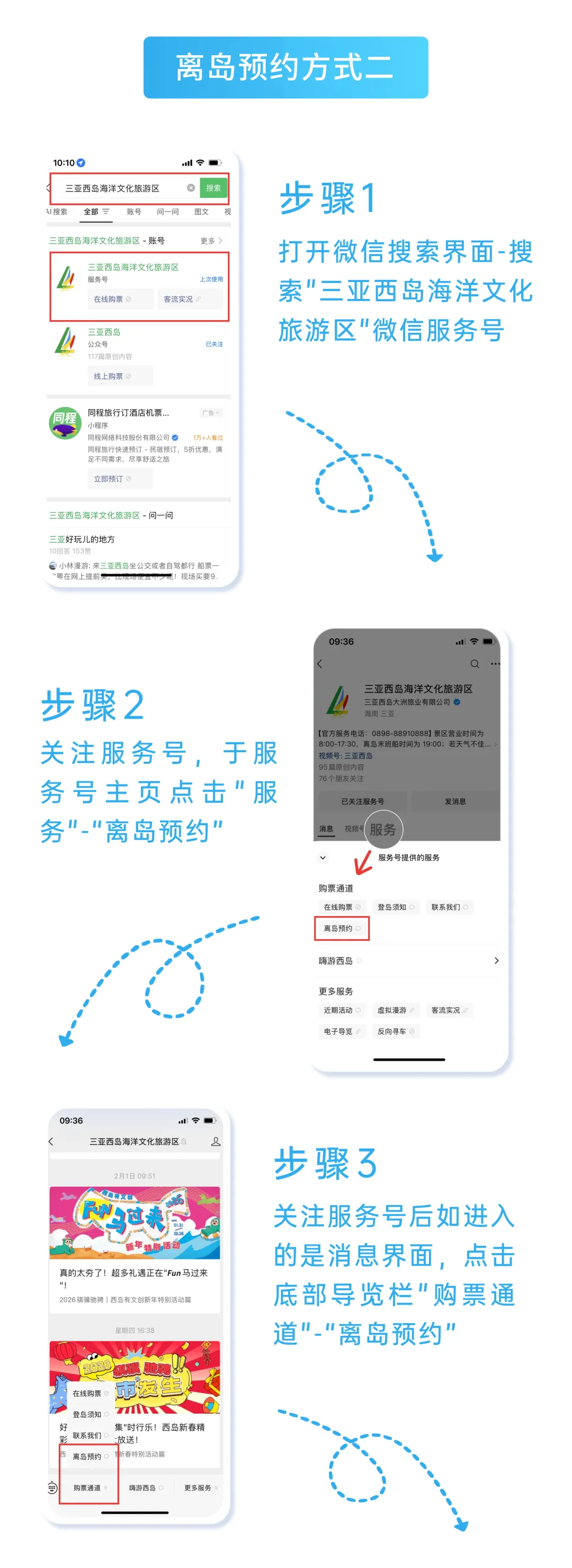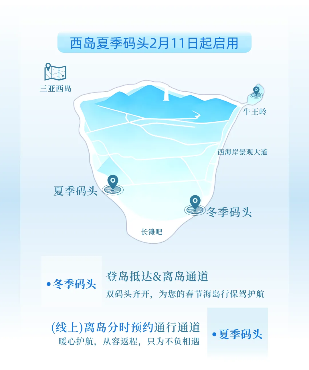 新春启序,马年送福,为切实提升游览体验,有效缓解春节旺季期间离岛排队压力,自2月11日起正式启用夏季码头,与原有运营的冬季码头形成 “双码头联动,分流通行” 的离岛模式,进一步提升离岛通行效率,让您的西岛离岛行程更加便捷顺畅。值此2026年春节旅游旺季来临,三亚西岛景区游客接待量持续攀升,其中登岛高峰期为每日10:30-13:30,离岛高峰期为每日16:00-18:00。为进一步优化您的游览体验,切实保障登岛、离岛环节高效有序,减少您的等候时长,特此温馨提醒并建议:请您合理规划游玩时段,错峰登岛、离岛;也可提前通过线上预约方式规划自身离岛行程,确保出行顺畅。具体离岛预约指引如下: