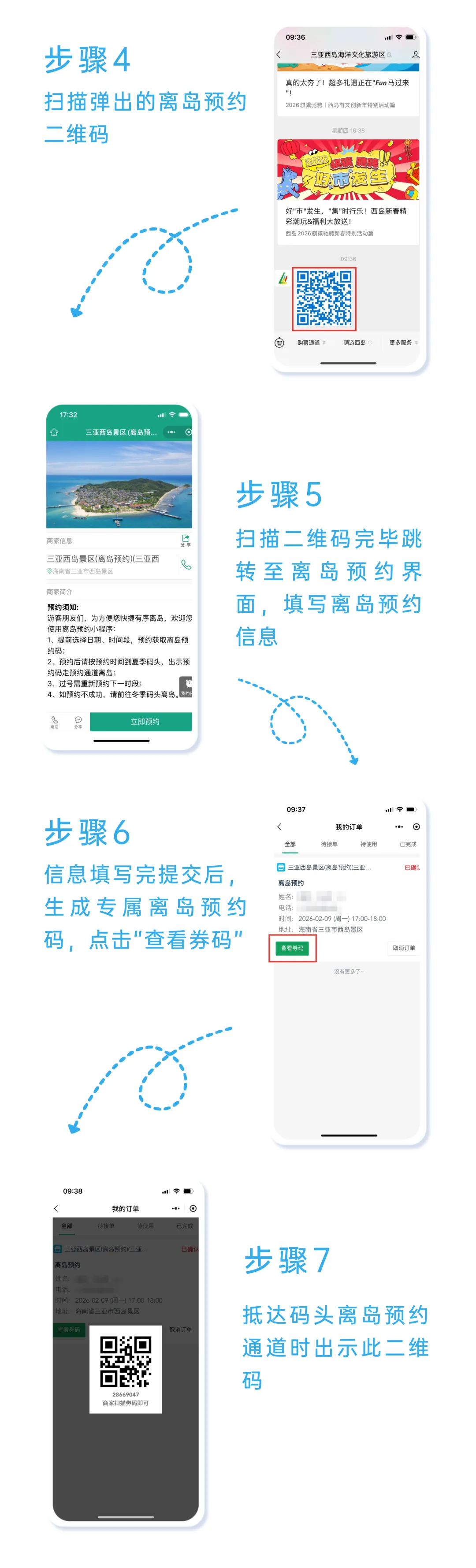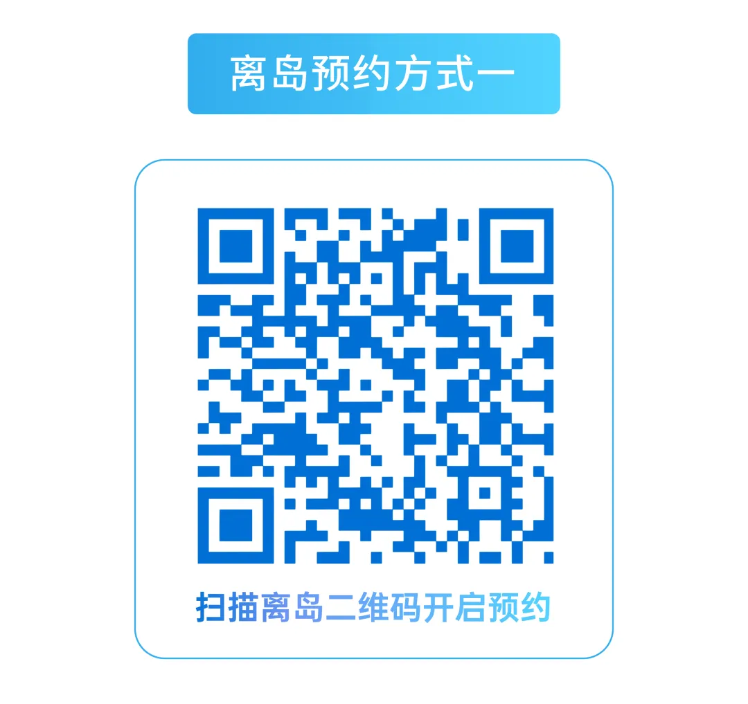 1.离岛分时预约,扫描二维码即可操作,预约平台全天候开放,成功预约将生成专属离岛预约码;2月11日起启用夏季码头作为离岛预约专用码头,每日15:00起开放该码头离岛预约专用通道,通道开放时段为15:00-离岛末班船(具体时间以当日实际运营为准)。已成功完成预约的游客朋友,可前往夏季码头预约离岛通道通行,凭预约码快速便捷完成离岛流程。