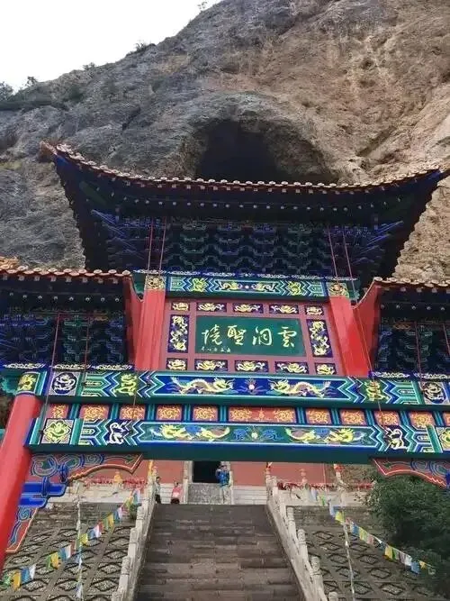 雷音寺“洞内有院、院内有窑、三教合一、层叠递进”,是中国溶洞寺庙建筑的孤例。寺前设108级汉白玉石阶,喻指踏过人间百八烦恼,消灾纳福;石阶顶端矗立“云洞胜景”牌坊,彩绘龙凤呈祥、二龙戏珠,与龙文化一脉相承。寺院主体分三层院落、十二殿堂、三十余间屋舍,依溶洞地势而建,洞顶天然穹顶如华盖,钟乳石垂落如璎珞,洞壁摩崖石刻历经千年依旧清晰。