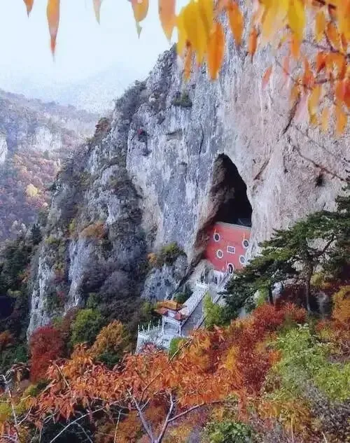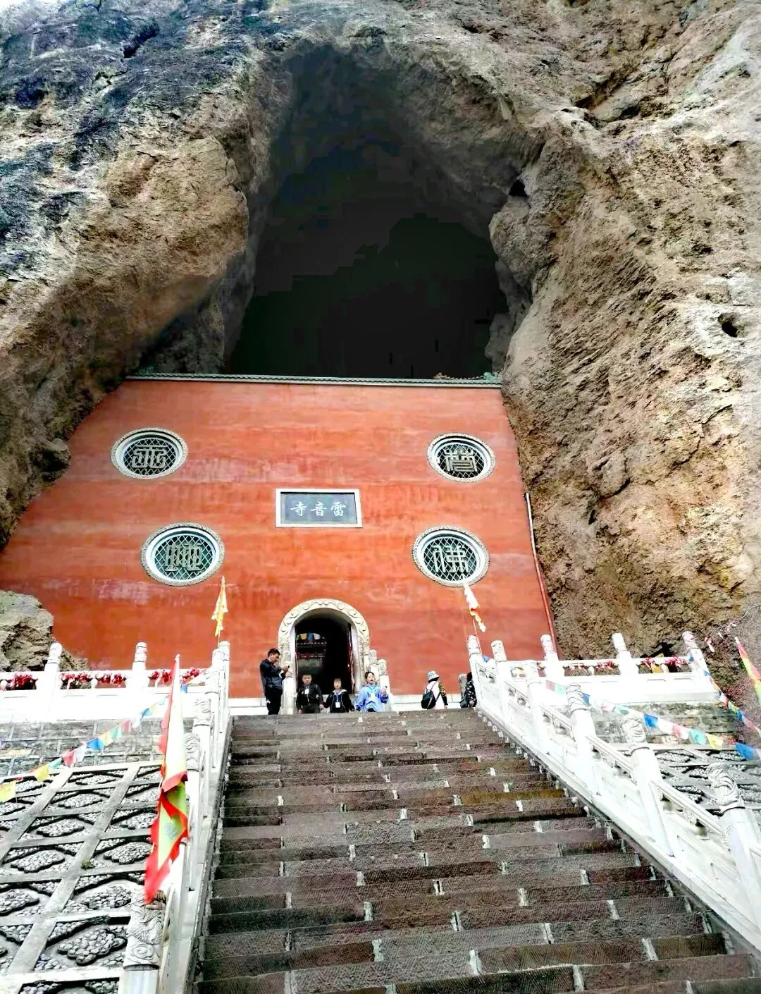 景区的人文巅峰,是被誉为“中华溶洞第一寺”的雷音寺(龙窑寺)。这座嵌于半山天然溶洞的古刹,始建于周朝,初为供奉十龙神的“十龙洞”,南北朝时改建为雷音寺,距今已有三千余年历史。溶洞高约45米、宽52米、深38米,属奥陶系白云岩天然巨洞,洞口距山脊与谷底各百米,危崖环抱,云雾缭绕,堪称“崖藏古寺、洞纳梵音”。