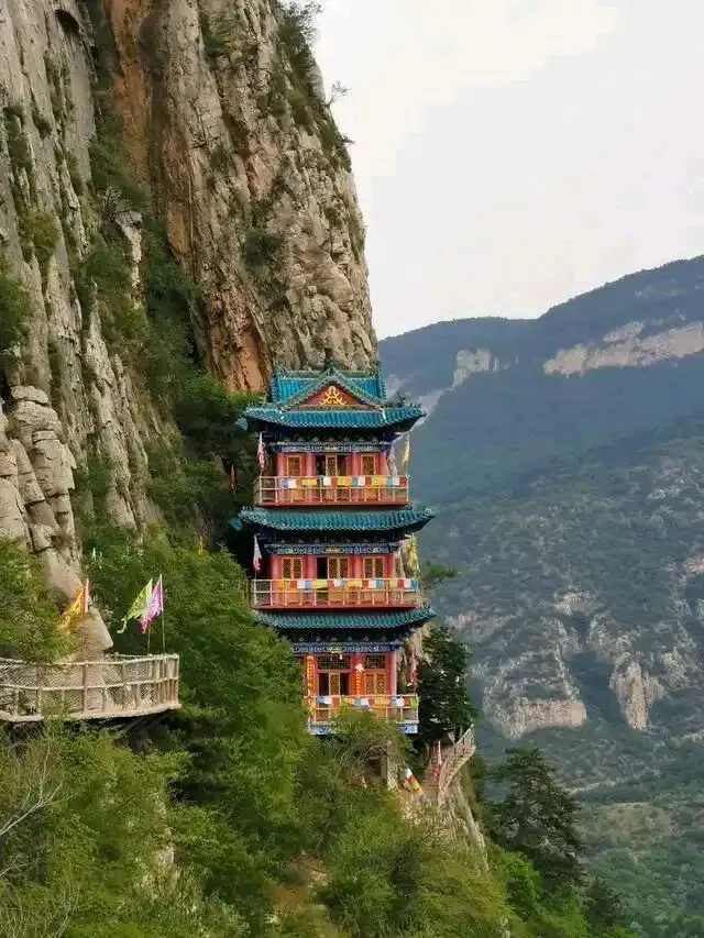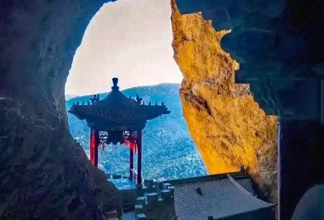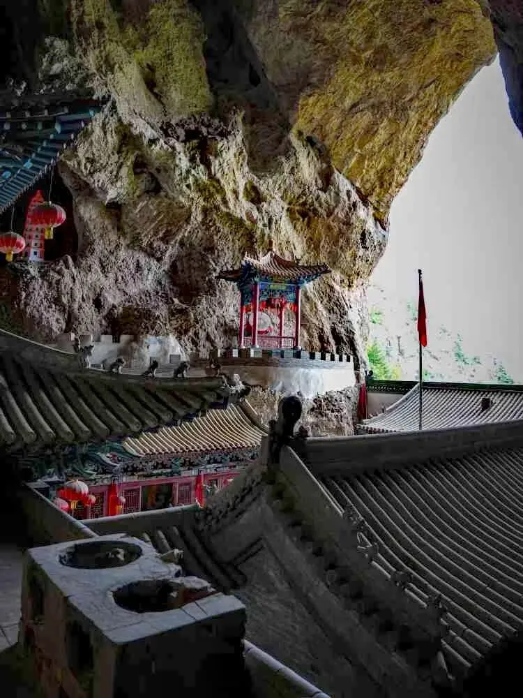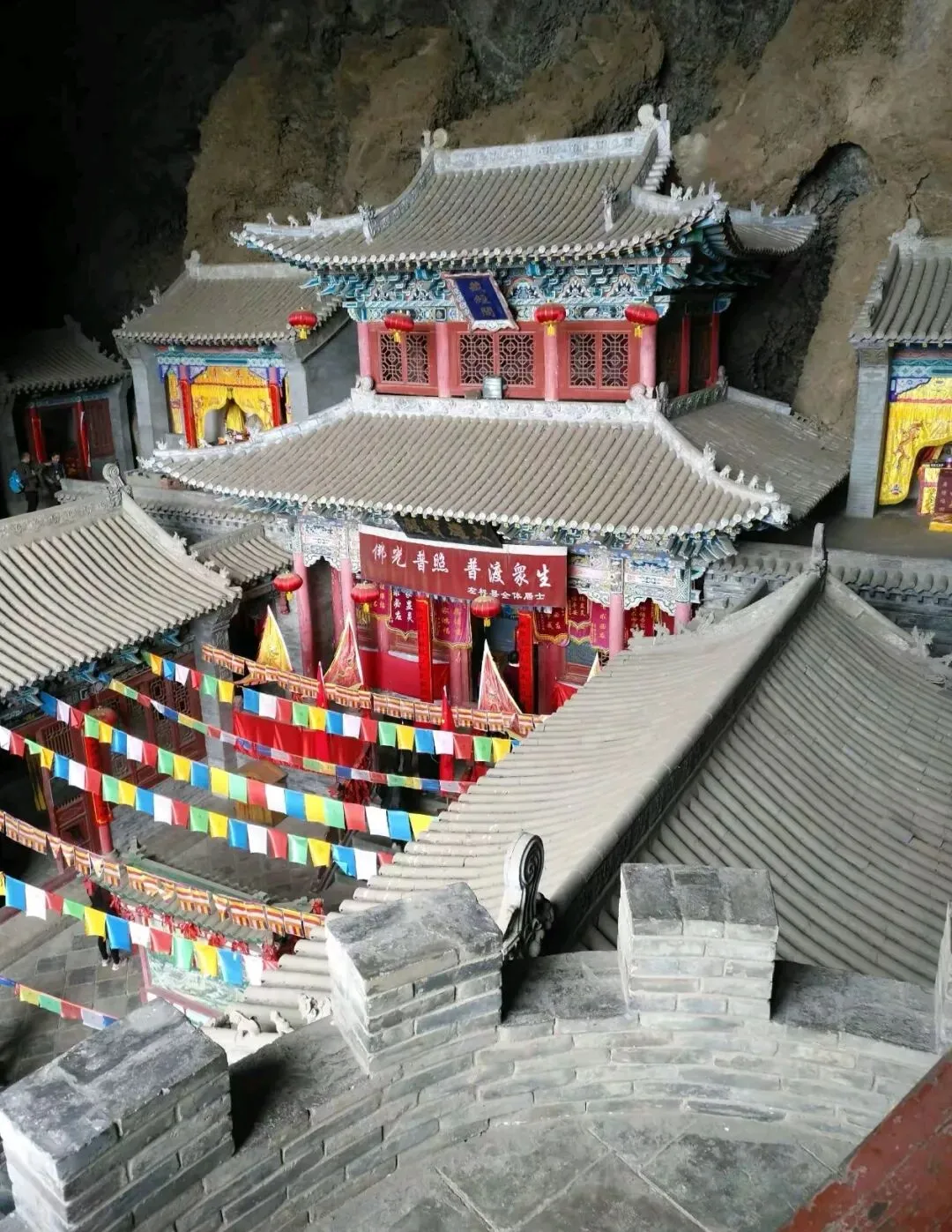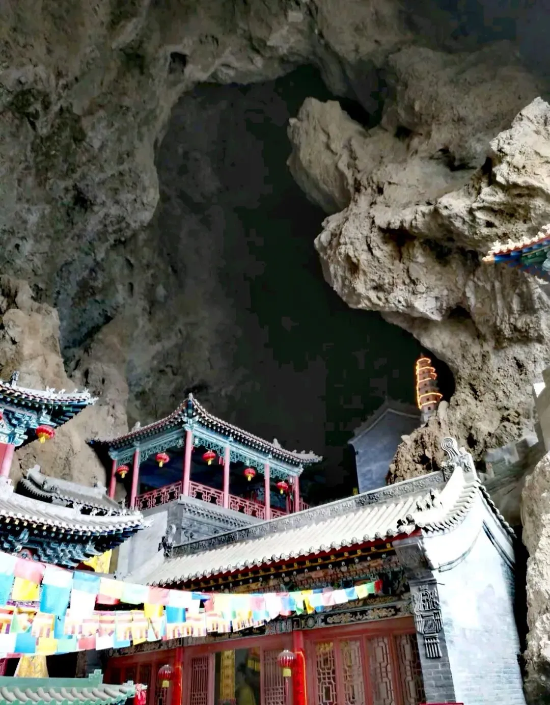 首层为天王殿与山门院落,迎门供奉弥勒佛,两侧四大天王威严伫立,殿侧设对称式钟鼓楼(二合为一,依洞而筑,全国罕见),晨钟暮鼓穿洞而出,回荡太行。中层为核心主院,正中大雄宝殿雄踞洞心,供奉释迦牟尼佛,两侧文殊、普贤菩萨相伴,宝相庄严;左为菩萨殿、右为子孙殿,对称布局,雕梁画栋;殿间廊庑连通,壁间绘佛本生故事与龙文化传说,佛道儒神像共处一洞,观音、龙王、文昌、关帝同龛受祀,尽显太行文化的包容共生。三层为藏经阁与祈福台,居高临下,可俯瞰龙泉飞瀑、远眺太行群峰,洞顶“一线天”天光倾泻,如佛光普照,洞内恒温宜人,冬暖夏凉,形成“室外冰雪、洞内暖融”的奇景。整座寺院洞、殿、楼、廊、壁浑然一体,无梁无柱却稳如泰山,人工建筑与天然溶洞完美融合,是宗教、建筑、地质、艺术的四重瑰宝。