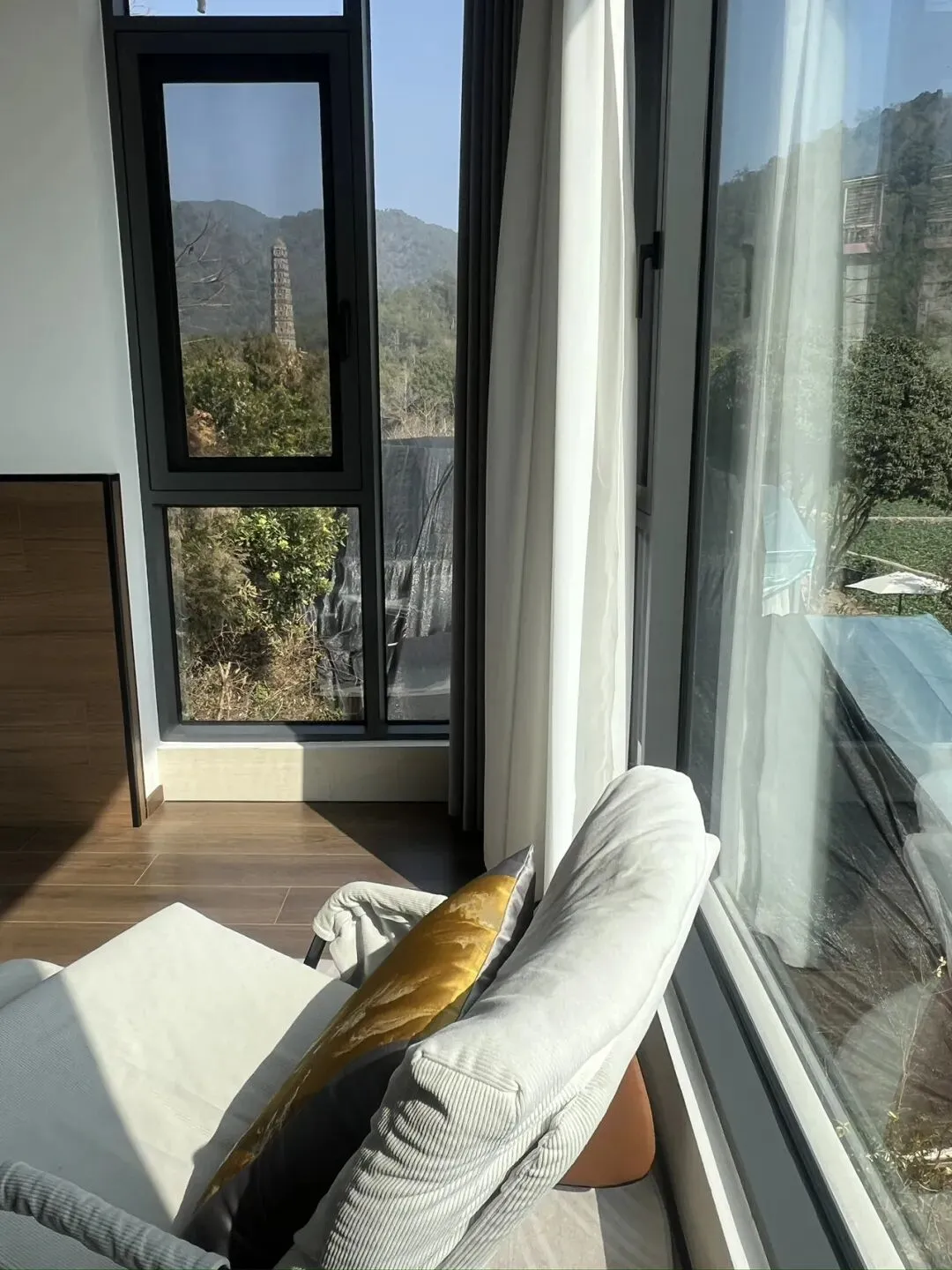 民宿的位置堪称绝佳——它是国清寺附近唯一一家,能在房间里直接看到隋塔的民宿。清晨醒来,拉开窗帘,隋塔的剪影便映入眼帘,远处是大片的油菜花田,金黄的花海在风里起伏,禅意与生机在此刻完美交融。