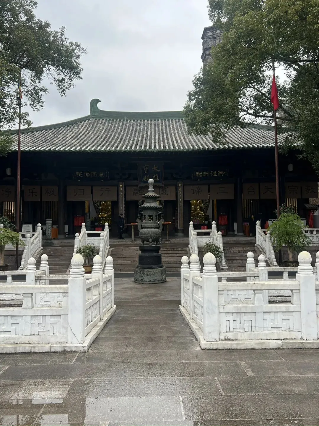 寺内的隋塔是不可错过的景致,这座始建于隋开皇年间的古塔,历经千年风雨依然挺拔,砖缝里长出的草木,像是时光刻下的注脚。而国清寺的禅意,更藏在细节里:大雄宝殿前的千年古樟,遮天蔽日;放生池里的锦鲤,悠然游弋;殿角的铜铃,在风里叮当作响,每一声都像是在叩问内心。
