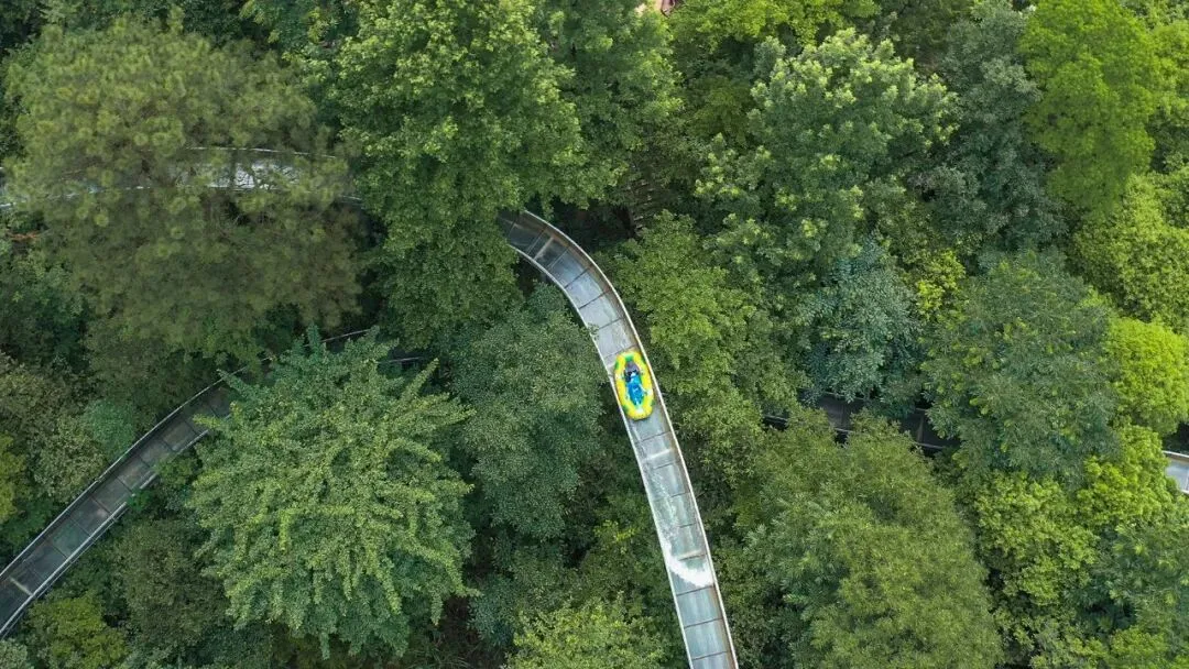 玩完“窝囊版”漂流意犹未尽?抬头望望天空,一条蜿蜒曲折的玻璃滑道高悬林间,升级版的“空中漂流”是探险者的乐园。全长约600米,S形的滑道依山势蜿蜒而下,垂直落差达30余米。游客们在穿越森林竹海观景的过程中,可以畅享最高时速达60公里的快意,还能感受林间清风、鸟语花香,尽享夏日凉爽。