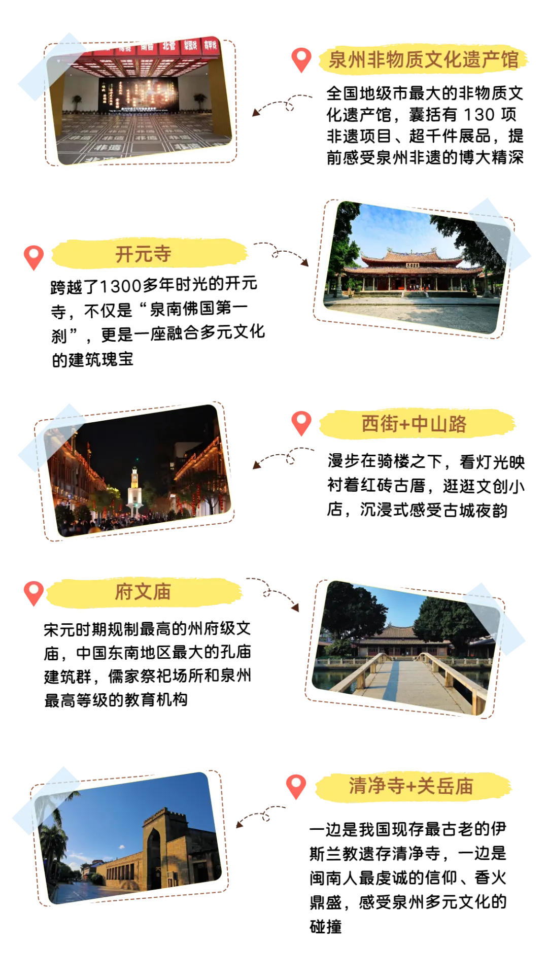 预约指南:泉州非遗馆、开元寺,需提前在对应场馆公众号预约,免费入场,旺季建议提前1天锁定名额。