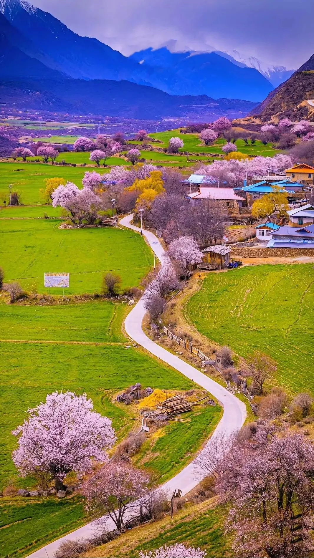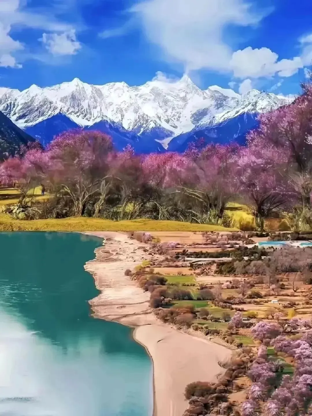 林芝地区的桃花是高原桃花,很多地方山脚桃花盛开,树高花繁,开得狂野,而山上则是雪峰,独有风味。