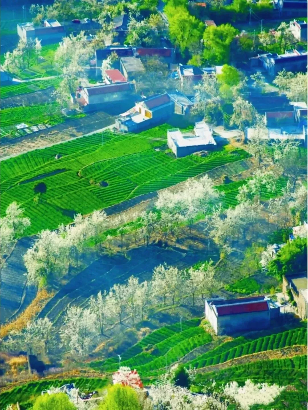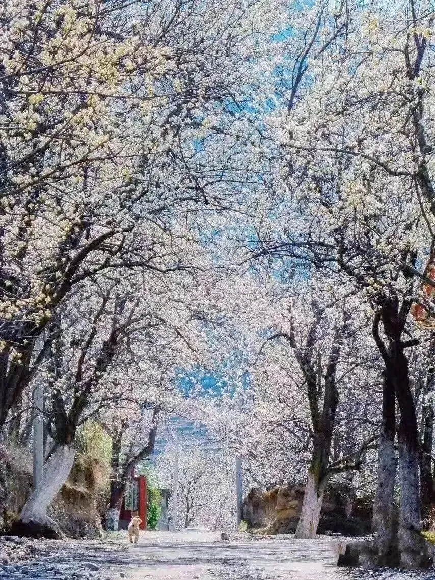 赶上下雪天,山顶还在下雪,山下却是漫山梨花花海!春风吹过,白雪与梨花齐飞,两相辉映,美景倒映在河水中,惊艳在人的心里!