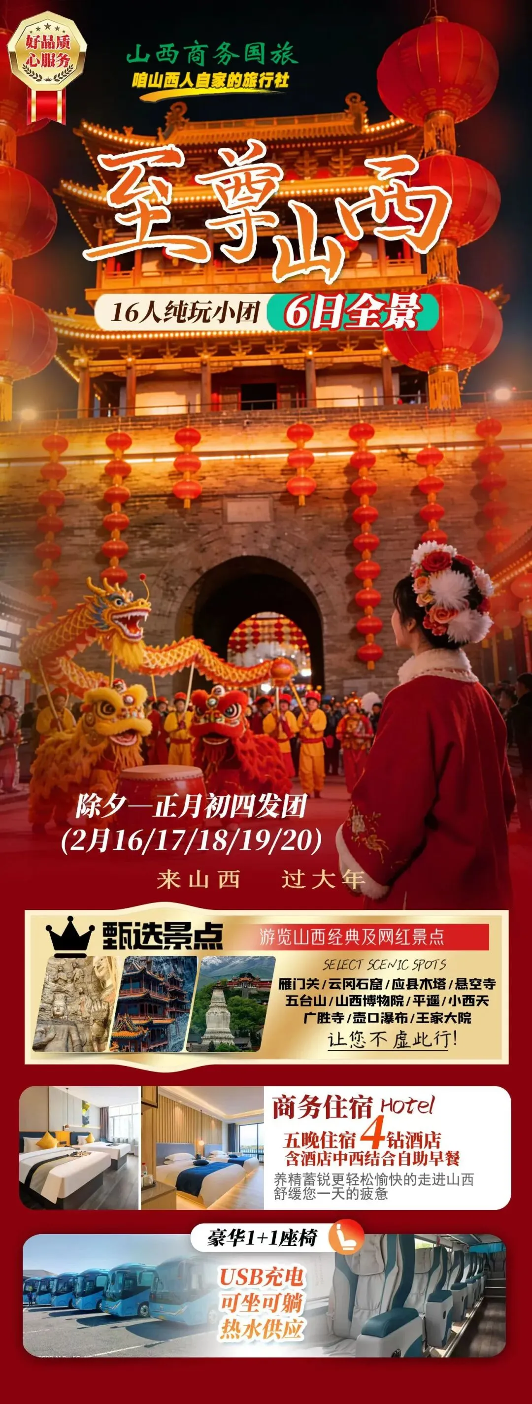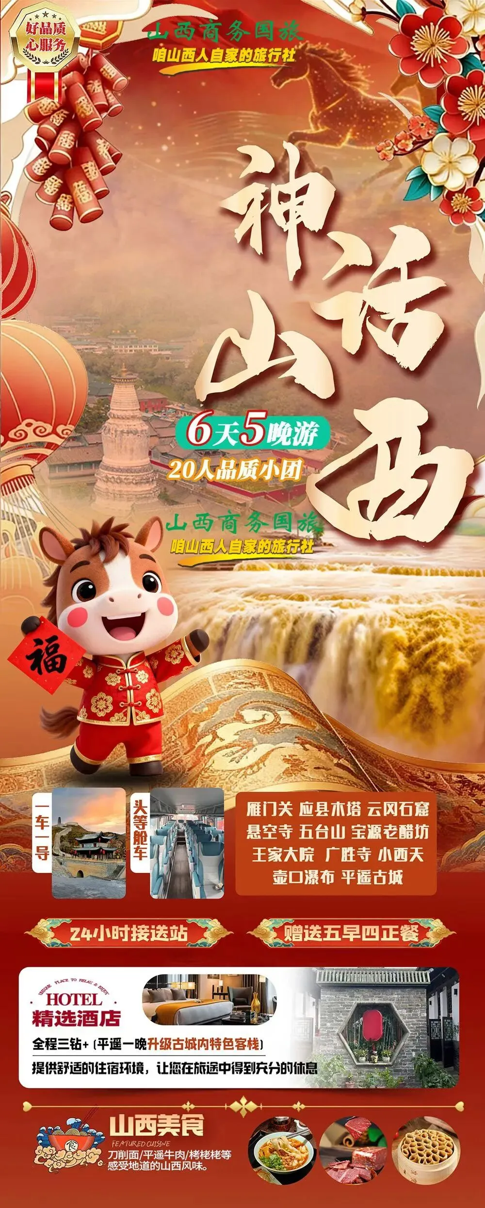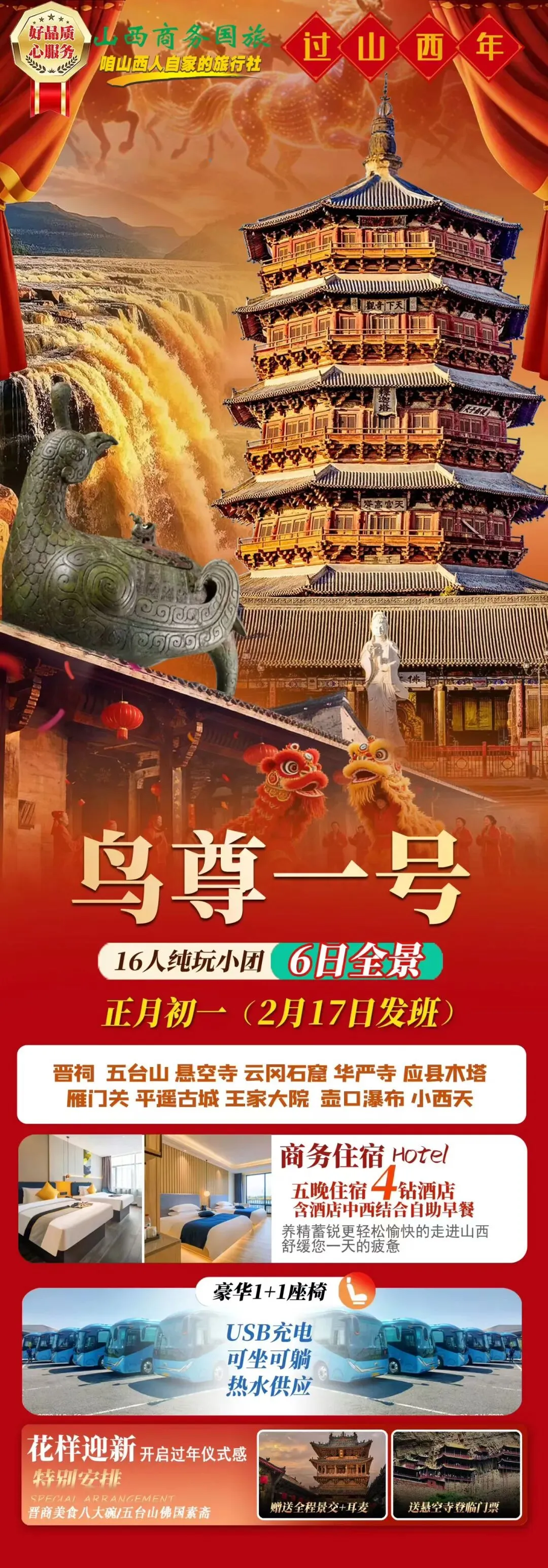 我们专为春节打造【味道山西】【至尊山西】6日全景游,一次旅程,集齐世界遗产、古建奇迹、晋商文化、黄河风情,更深度融入山西特色年俗活动,带你过一个不一样的文化团圆年!