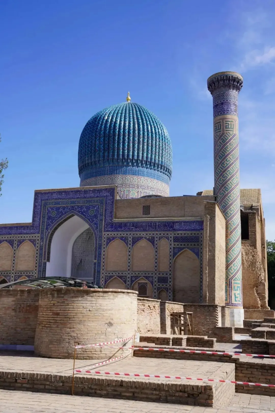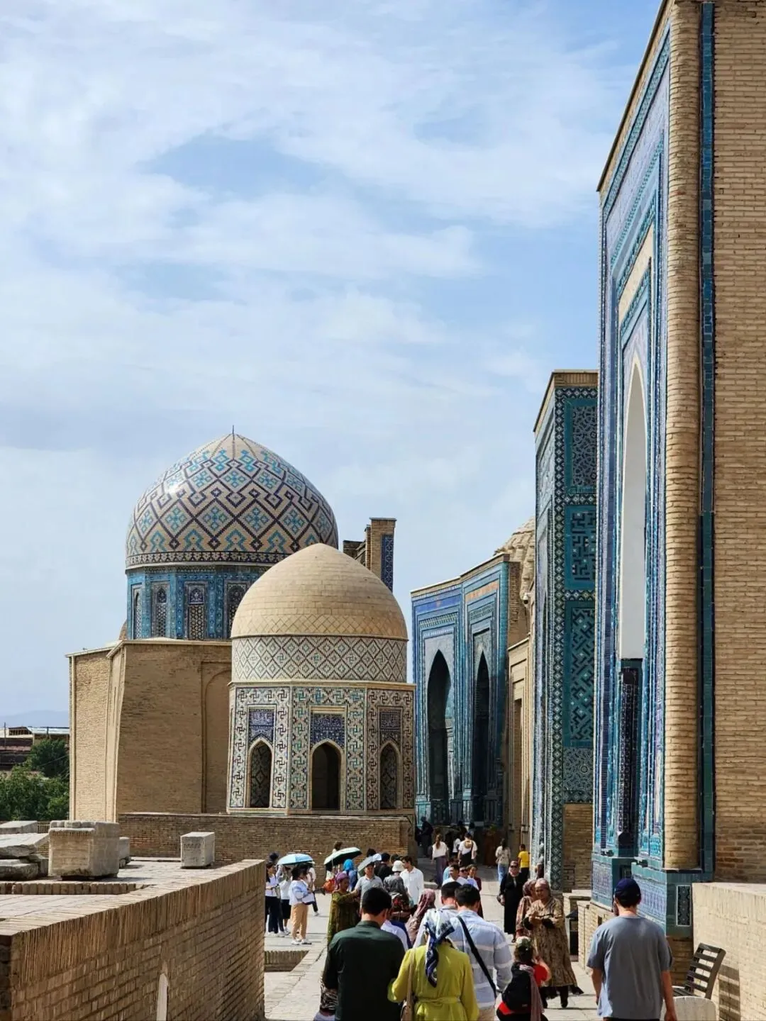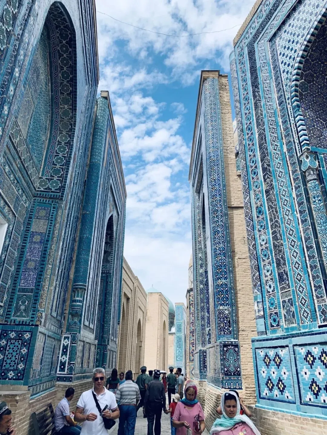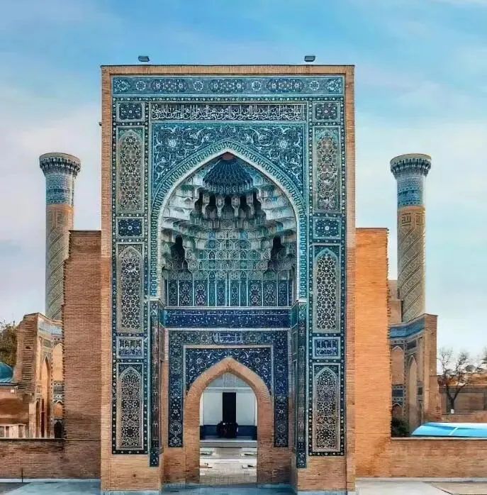 夏伊·辛达意为“永生之王”,代指伊斯兰教早期传播者穆罕默德的表亲库萨姆·阿巴斯,被尊为“永生之王”,这个墓葬群后来成为了帖木儿家族女性家族成员的安息地。在这里我们可以明显地感受到伊斯兰人民对几何线条的执着于马赛克的痴迷,变幻莫测的空间,蓝色系、白色、浅色色系精心堆砌的繁复图案,让这个陵墓群变得浪漫又唯美。