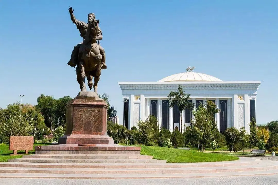 广场中矗立着帖木儿大帝的雕像(乌兹别克斯坦共有3个帖木儿大帝雕像,其它两个位于撒马尔罕和沙赫里萨布兹),大帝身着戎装,纵马奔驰,右臂前指,一副征服者的霸气姿态。塔什干整座城市从这里辐射而出。