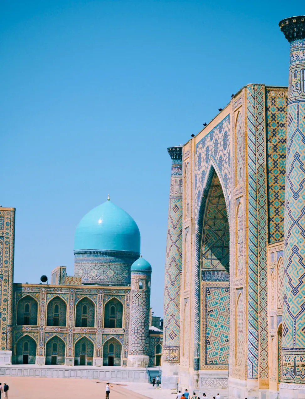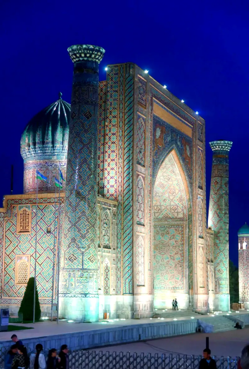 广场上矗立着3座宏伟的伊斯兰建筑,分别是兀鲁伯神学院、谢尔多尔神学院和季里雅-卡利神学院,中世纪的人们在这里集会,聆听圣训。其中兀鲁伯神学院思想前卫,允许女子听经,院内立有开明的统治者兀鲁伯雕像,供人瞻仰。这些建筑以华丽的蓝色瓷砖装饰、精美的拱门和精致的雕刻而著称,展现了中亚建筑艺术瑰丽与辉煌。