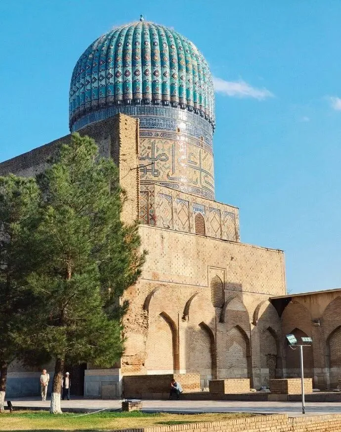 外径18米,顶高40米,是帖木儿帝国时期东方最雄伟的建筑物,由帖木儿的王后比比·哈内姆主持建造的。清真寺的主礼拜堂是双重穹顶结构,中庭四周是由480根柱子支撑的厅和围廊,其屋顶由许多小穹顶组成,壮观华美。