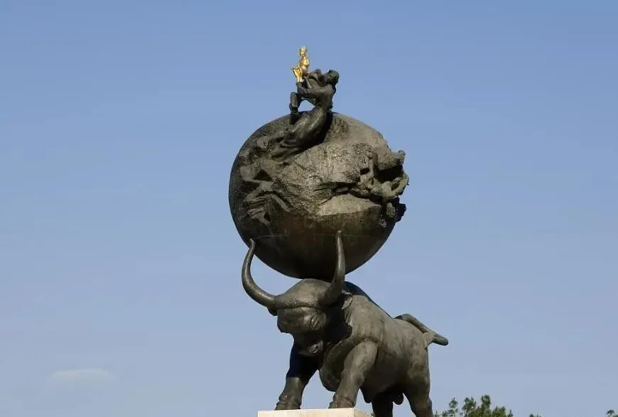 是1998年建立为了纪念1948年发生的特大地震(11万人遇难),这次的地震被称为是20世纪最严重的自然灾害之一。广场上的特色雕塑是青铜公牛造型,肩膀扛起象征地球的皲裂球体,在裂缝处雕塑着一位母亲,托举起婴儿。除了地震纪念碑,在中立广场上还有中立门,三腿支撑圆柱(寓意独立、中立、民族团结),圆柱上矗立的是土库曼独立后的首位总统尼亚佐夫雕像,神奇的是这个金雕像会随着太阳的方向转动。