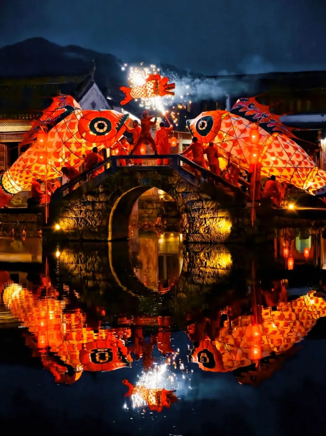 4、鱼灯巡游: 夜晚的重头戏,非遗鱼灯在古村中巡游,搭配烟花,仿佛辛弃疾笔下的“一夜鱼龙舞”场景重现,震撼人心。