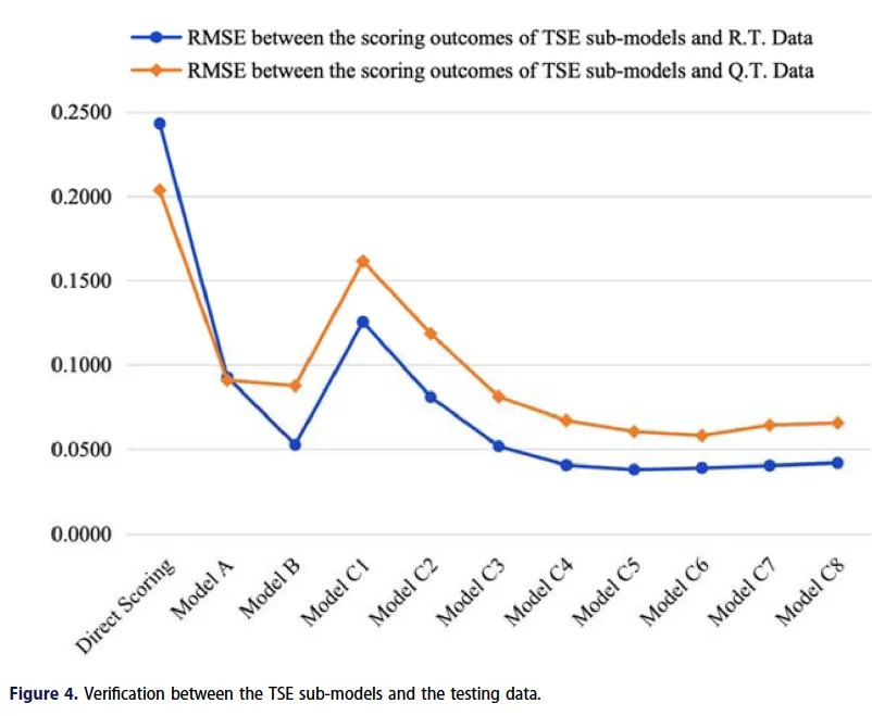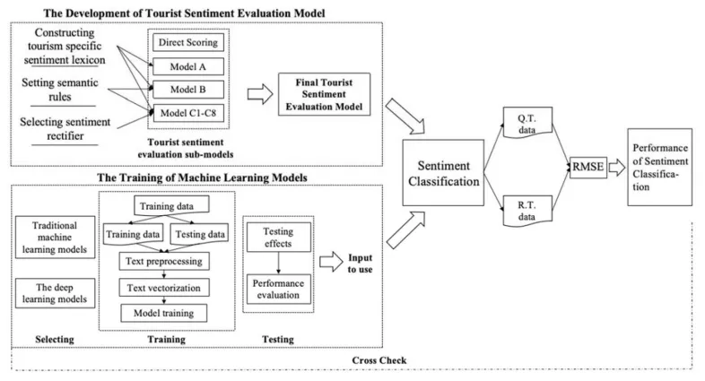 本研究构建了一个涵盖多种旅游场景的大型语料库,由此提炼出情感词典,并设定语义规则和程度副词,利用问卷调查数据(Q.T. Data)和人工阅读数据(R.T. Data)作为基准,测定最优的情感乘数,形成优化后的TSE模型。随后研究选取了包括深度学习算法在内的多种主流的机器学习模型与优化后的TSE模型比对。我们以均方根误差(RMSE)作为核心评价指标。均方根误差对极端误差高度敏感,其值越小,表明模型情感分类效果越好。数据处理流程如图2所示。