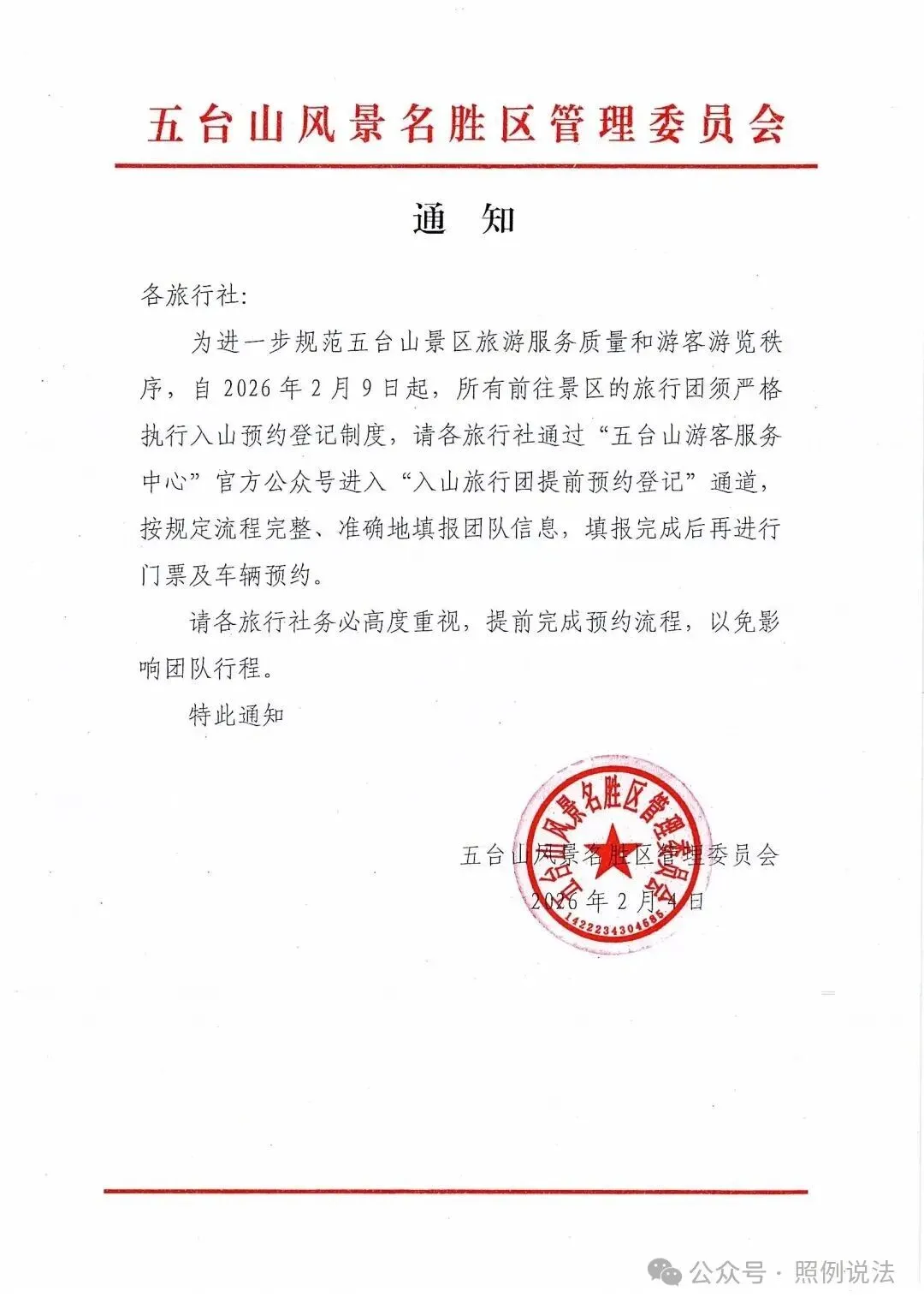 各旅行社: 为进一步规范五台山景区旅游服务质量和游客游览秩序,自2026年2月9日起,所有前往景区的旅行团须严格执行入山预约登记制度,请各旅行社通过“五台山游客服务中心”官方公众号进入“入山旅行团提前预约登记”通道,按规定流程完整、准确地填报团队信息,填报完成后再进行门票及车辆预约。 请各旅行社务必高度重视,提前完成预约流程,以免影响团队行程。 特此通知