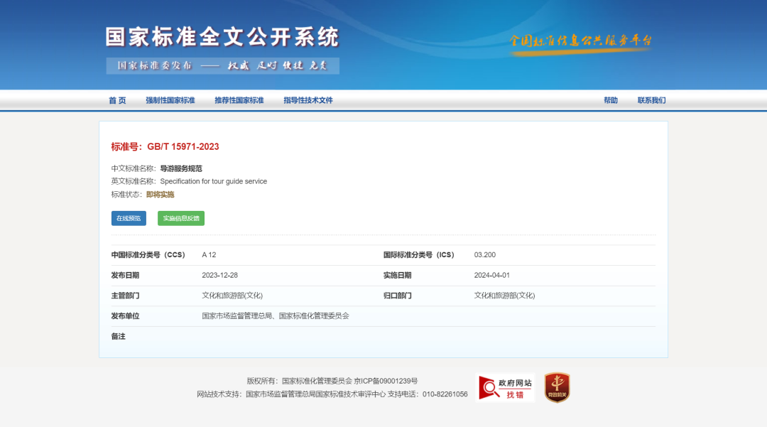 您现在的位置是:首页 > 国内旅游目的推荐 > 正文 国内旅游目的推荐 新《导游服务规范》将于4月1日起实施! admin2024年02月16日 17:07:40国内旅游目的推荐146 新《导游服务规范》将于4月1日起实施!(附:全文)近期,国家市场监督管理总局(国家标准化管理委员会)批准发布423项推荐性国家标准和2项国家标准修改单。由文化和旅游部主管、全国旅游标准化技术委员会归口及执行的国家标准《导游服务规范》(GB/T 15971-2023)位列其中。该标准在近30年间历经三次制修订,最新的修订于2021年底获得立项,2022年4月公开征求意见,2023年底批准发布,于近日公布文件内容,将于2024年4月1日起开始实施。新版标准修订的主要内容包括规范相关表述、更新导游服务能力要求、优化导游服务内容要求、增加出境游领队服务要求、优化入境游导游服务要求、完善突发事件和常见问题的处理要求、增加导游服务质量评价内容。长按识别二维码 查看新《导游服务规范》全文来源:导游之家 转载请说明来源于"旅荐网",部分内容转载自网络,如有侵权请联系qlwl@foxmail.com删除 本文地址:https://www.15386.cn/post/10295.html 上一篇 8岁男孩在一水库边游玩时失踪 下一篇 几乎每位在南加州自驾游国人都被坑过的美国收费高速 相关文章 Part1:低成本旅游攻略 赛事+旅行攻略|参赛观赛两不误,携亲友解锁临高宝藏玩法! 纯手写成都旅游攻略�� 三天两夜 普吉岛,深度旅游攻略五天四晚 贵州保姆级旅行攻略|3 分钟 get 必玩景点 + 行程路线 + 美食地图! 河北单招考试五类/旅游类 报考资料+各院校录取分+位次 《呼伦贝尔市“十五五”文化和旅游发展规划》编制调研组一行莅临鄂温克族自治旗开展前期调研工作 当我一个人在大连旅行3天3晚花了319r(攻略 带家人去云南旅游费心费力?这份轻松不累的私人定制游攻略,让全家老小都玩嗨了!! 新鲜出炉!敦煌游玩攻略拿走不谢! 发表评论 取消回复 评论列表 这篇文章还没有收到评论,赶紧来抢沙发吧~